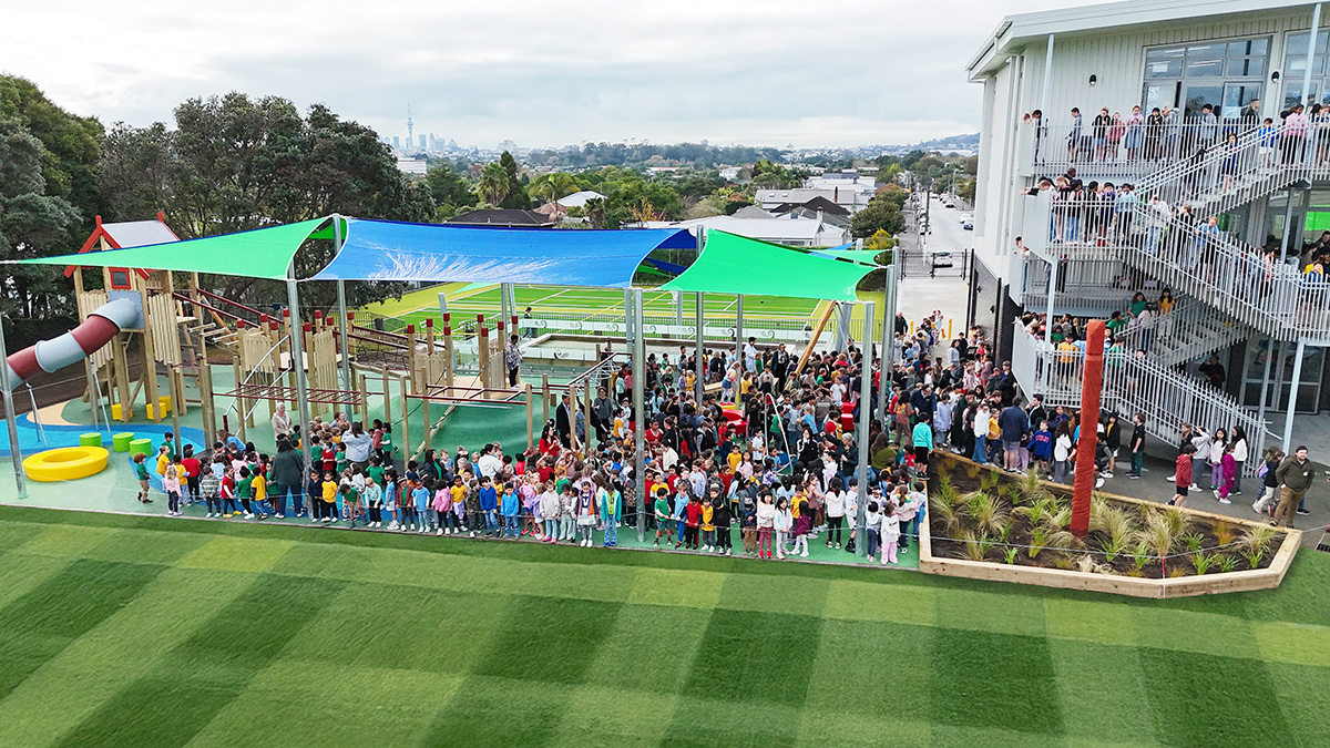 At the centre of the space sits a stepped mound inspired by Owairaka Maunga, created with subtle pā-themed detailing that acknowledges the area’s history. The custom matting design references the flow of nearby Oakley Creek, visually linking the different play zones. A Whare structure overlooks the playground, providing a natural meeting point for elevated socialising.