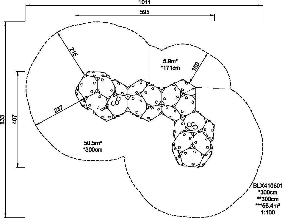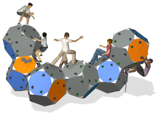 A massive climbing landscape is created out of these 6 modules. Bouldering routes in and out of angles and corners, under flying modules and maybe changing sides on the way, provide a number of extreme climbing challenges. From the top the most complex route leads downward. Only by feeling your way from foothold to foothold, having to secure your handhold along the way, the route out of the structure from the top to groundlevel is the toughest, only to be mastered by the most skillfull climbers.
