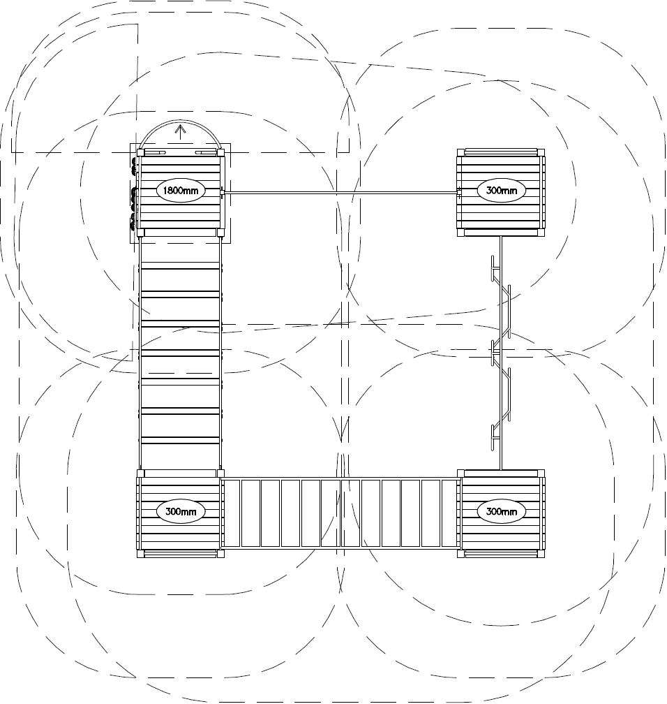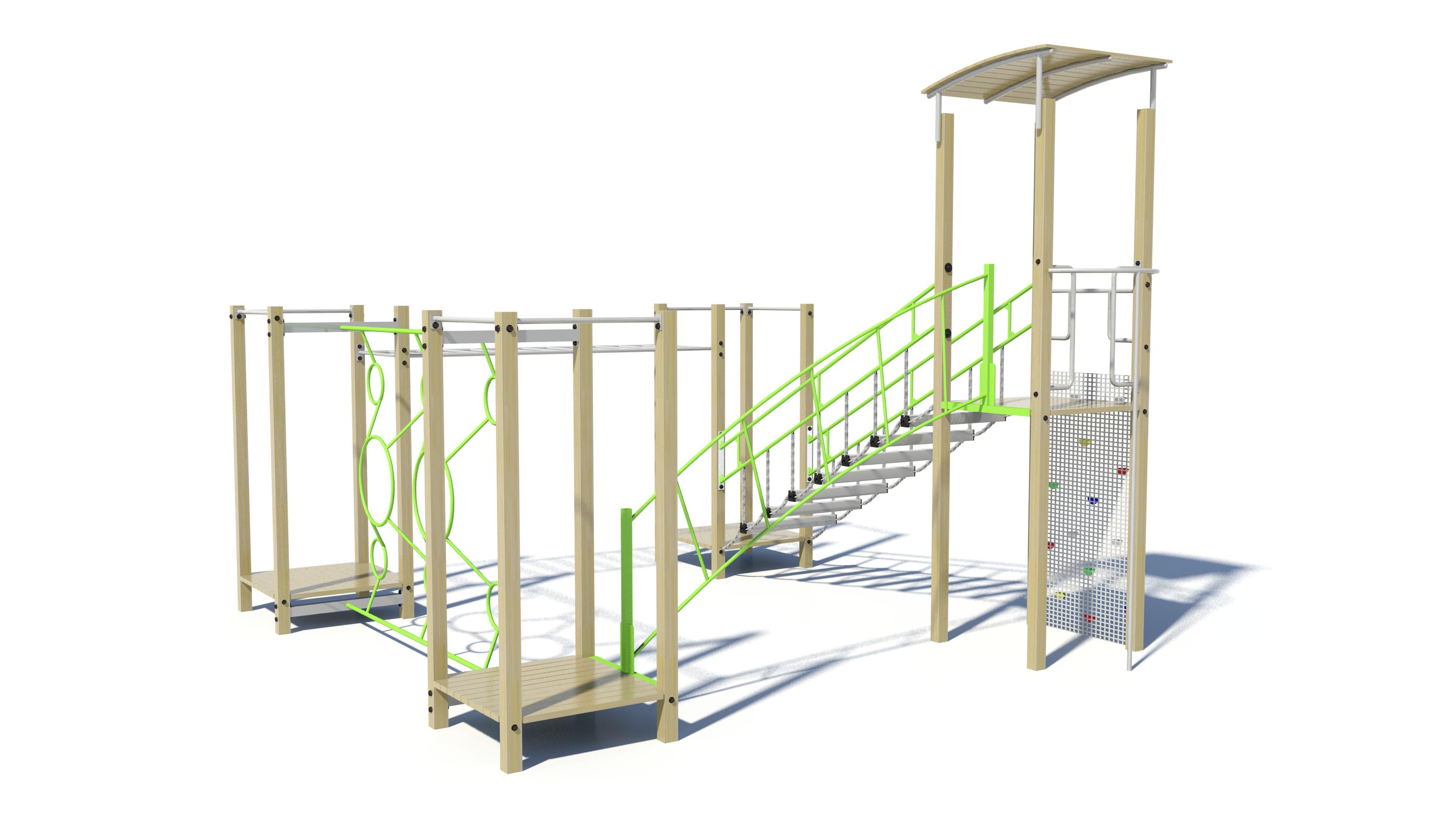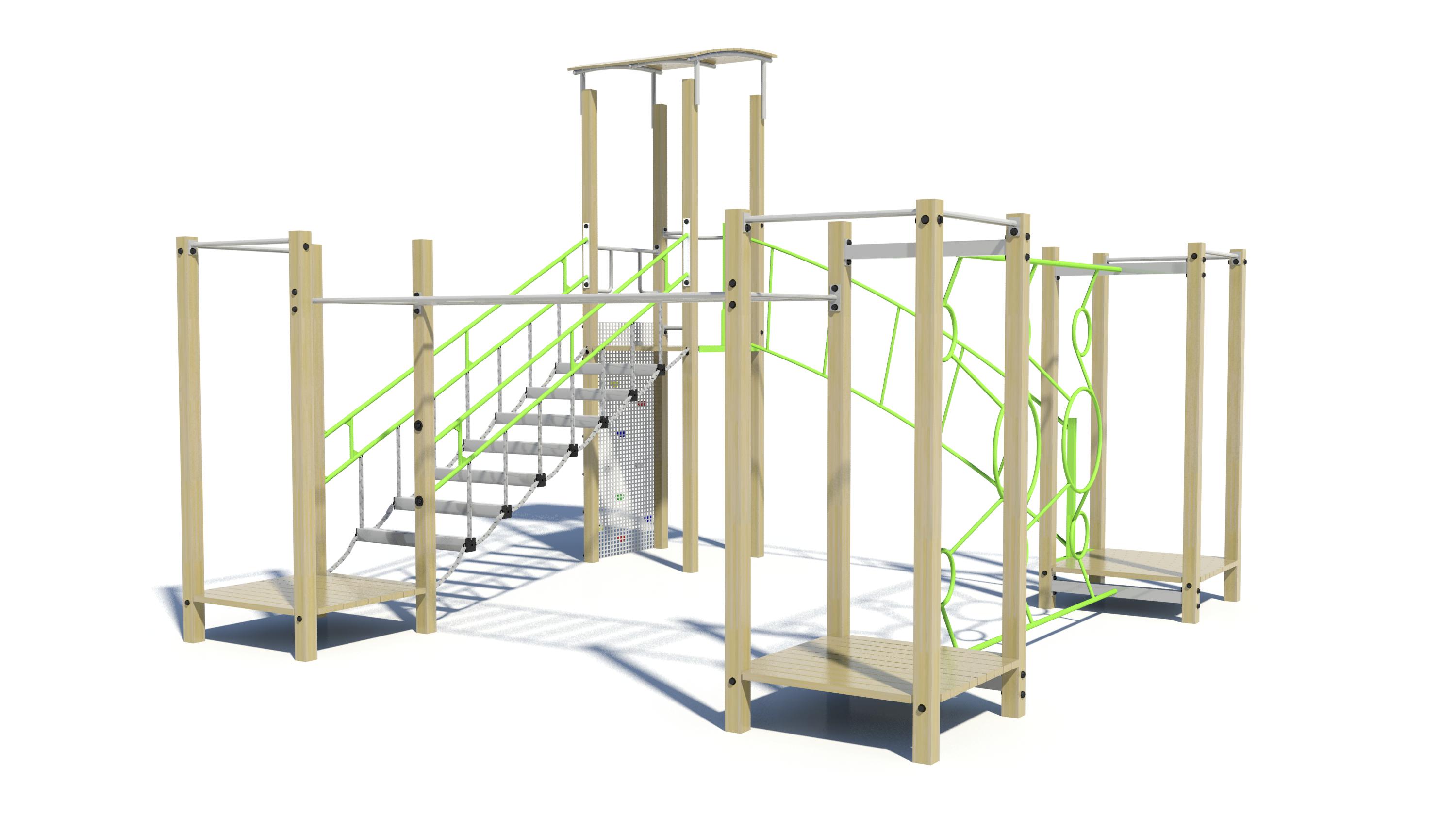 The Rook design is a compact play circuit that we have created for children aged 5 to 9 years+. For children to work their way around the circuit they will need to combine balance, hand/eye coordination and upper body strength. The With a firepole and three means of ascent the roofed 1.8m high deck provides a great viewing platform from which to survey the rest of the play area.