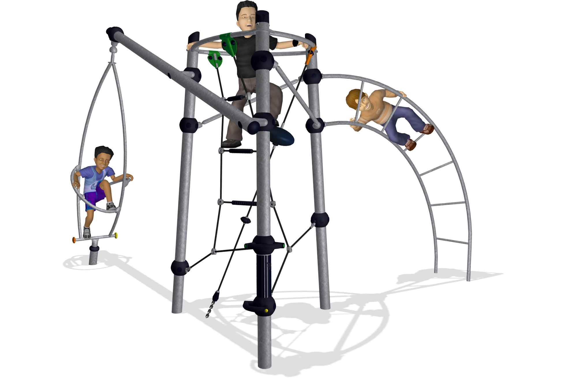 Spin, climb, meet and play - the Rigel offers a bit of everything. The Musca Spinner generates challenging centrifugal forces as one or more children send it spinning. The Jacob's Ladder, the Climbing Pole with Climbing Steps provides different ways to climb up and perch on the open rubber surfacing/coated triangle frame. Underneath the playshell offers a place to sit, lay or climb on and to watch the others or have a rest.