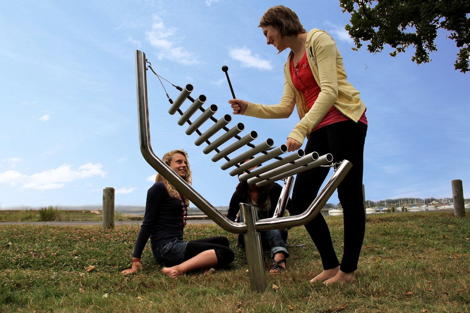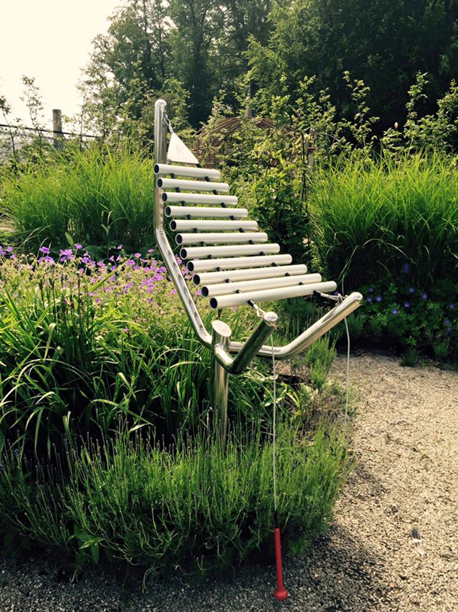 Like a vertical marimba or xylophone, the eleven thick anodised aluminium tubes are arranged lengthwise, horizontally and supported by heavy-duty nylon coated galvanised steel cables.