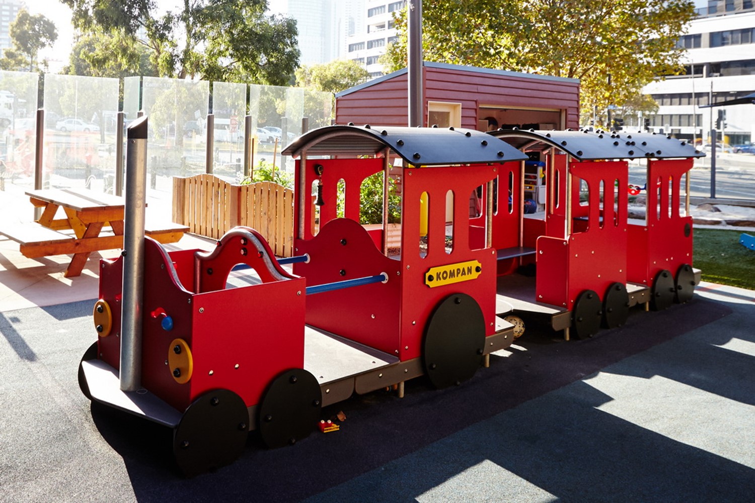 The driver's cab features a bench, various knobs and handles for steering the train, whilst the boiler house in front is the shape of an amazing cave with several entrances. A smart addition is the open playroom with seating for two, which is snugly situated just behind the chimney.
