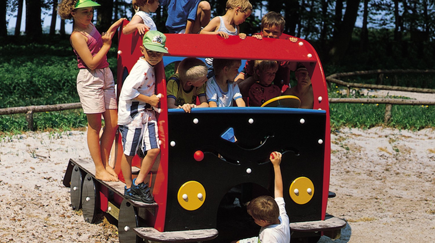This impressive truck from KOMPAN most certainly deserves to be called king of the road, while whizzing along the highways and byways of the imagination. The cab is equipped with a steering wheel, gear stick and even a sleeping-berth for weary drivers. There is an extra steering wheel, a chimney, table and plenty of space on the body of this tough working vehicle for passengers and goods alike.