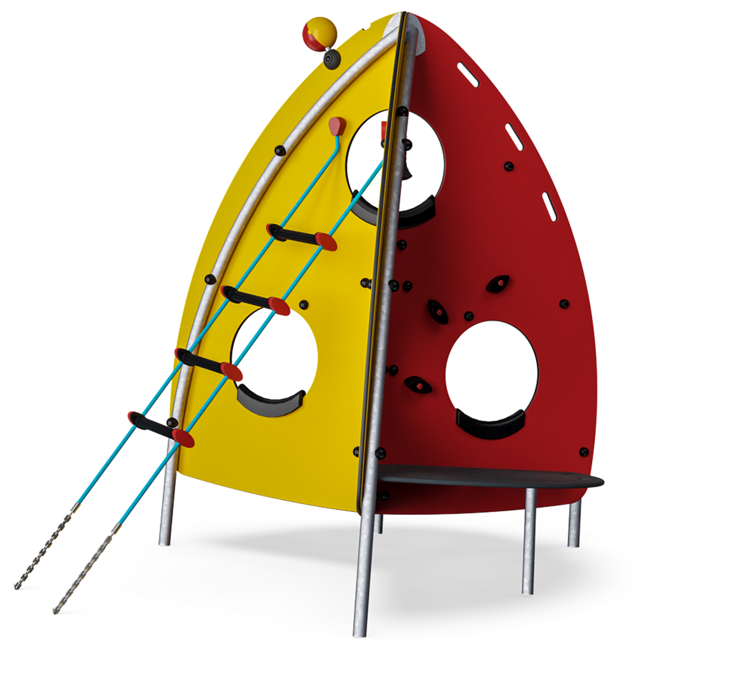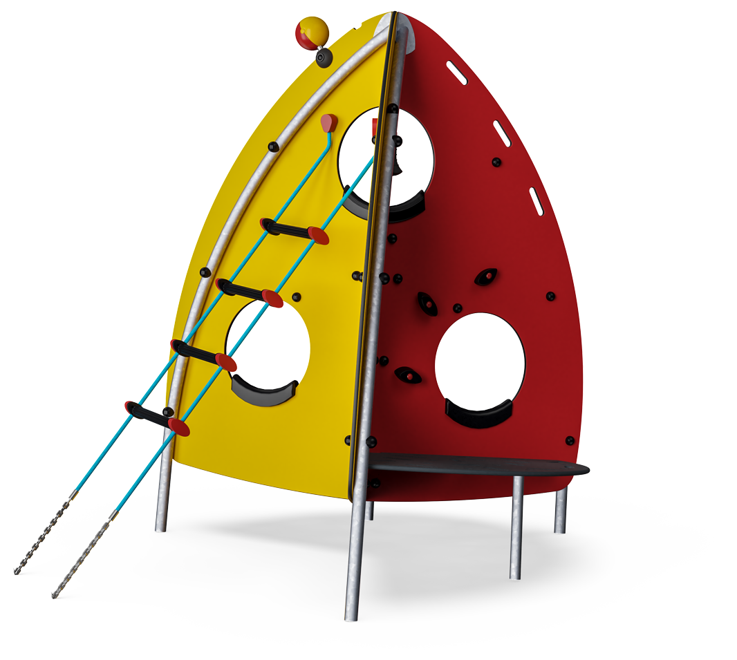 Here you'll find play and climbing for hours for boys and girls! The destination is the rattling antenna on top. Who will get there first? This is real training of the spatial sense: On one side you can choose climbing wall grips, on the other you have holes, and on the third side a rope ladder.