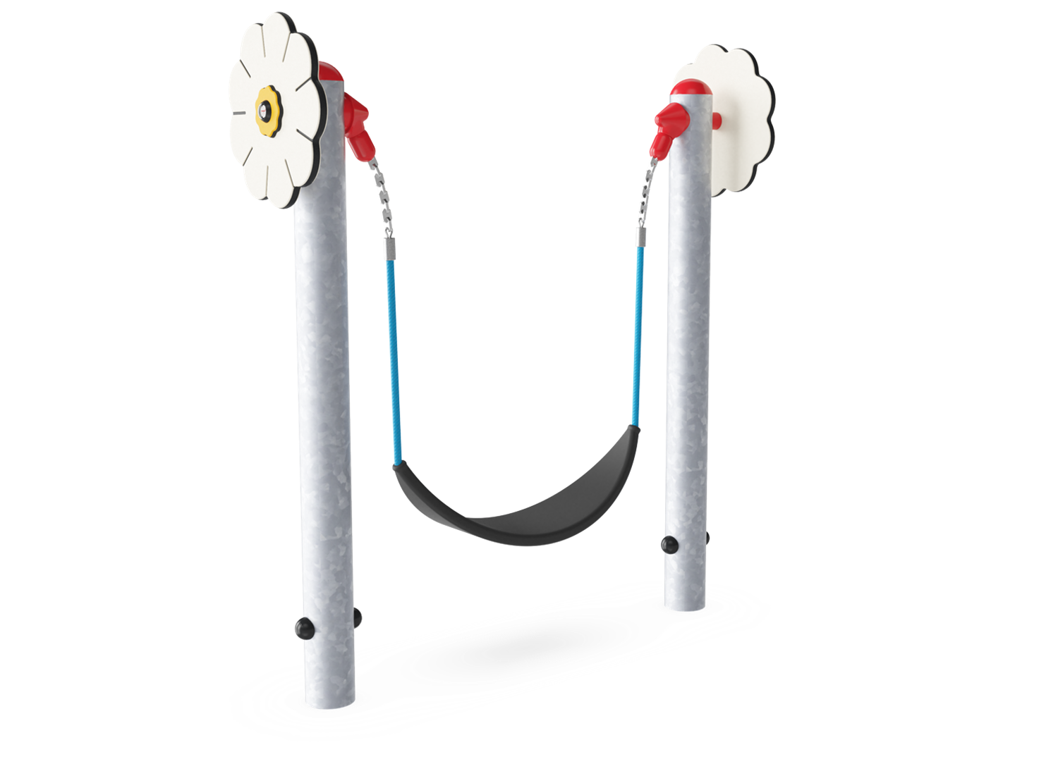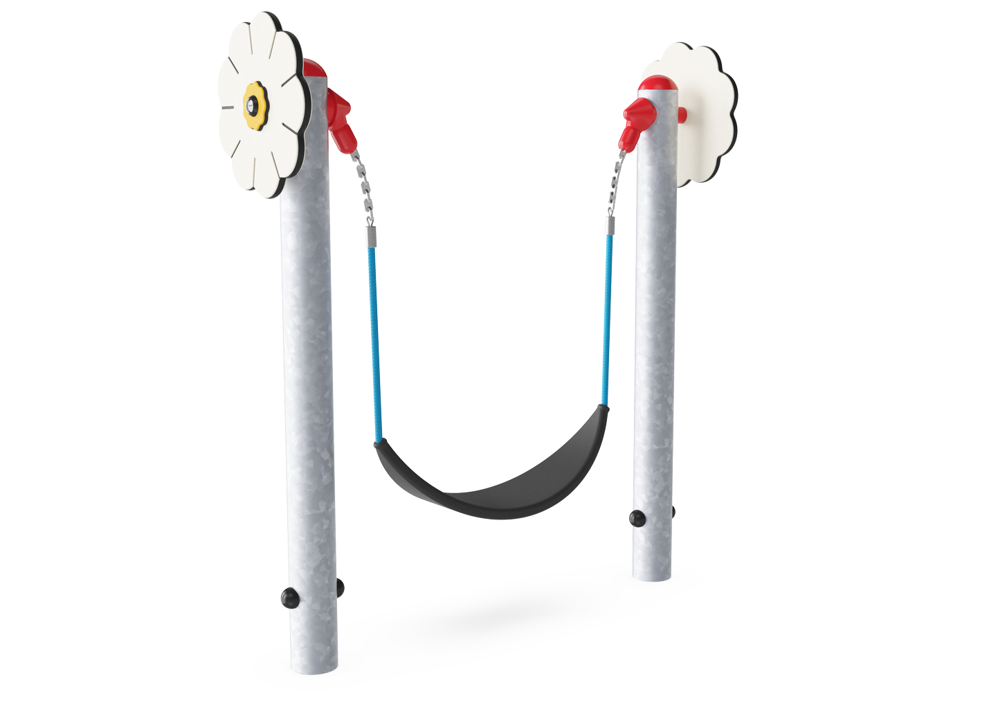 The soft blue rubber hammock seat of the Sunflower supports the child’s body in a short swinging movement when lying on the stomach, sitting on the knees or being seated. This gives the 1-4yearolds the opportunity of swinging with no adult assistance. The sunflowers on the swing posts signal play from far away and can be turned by older children or adults.