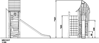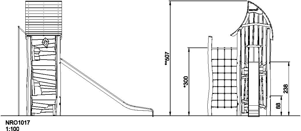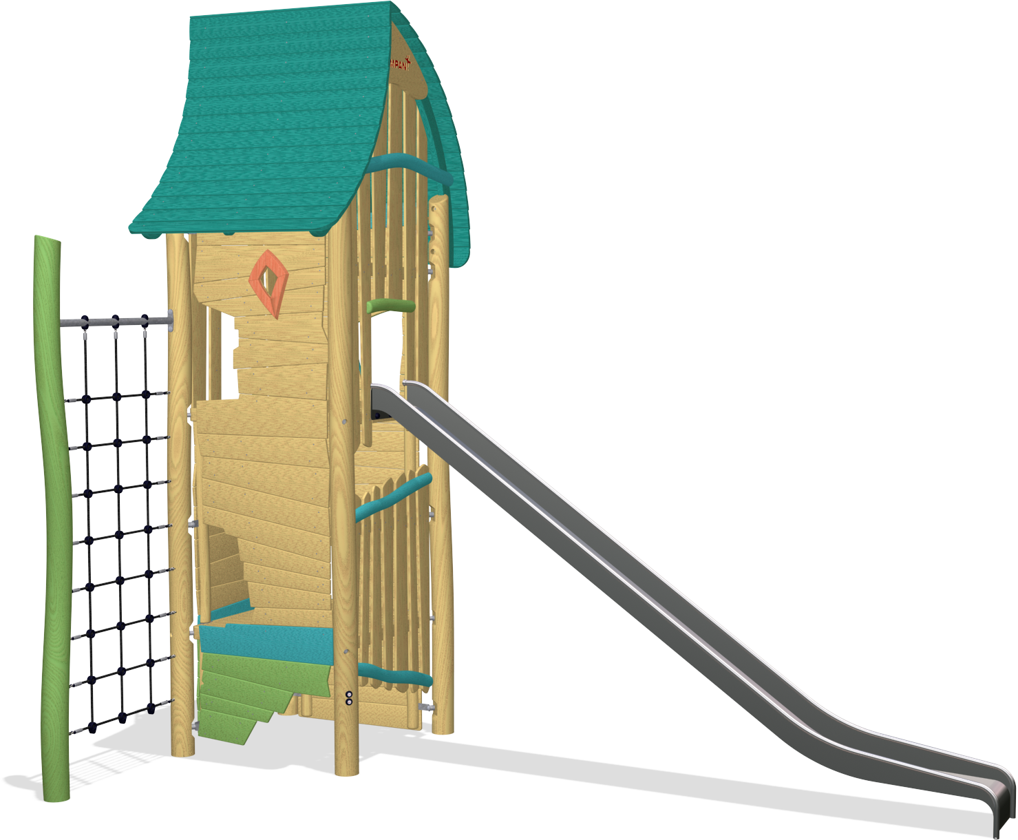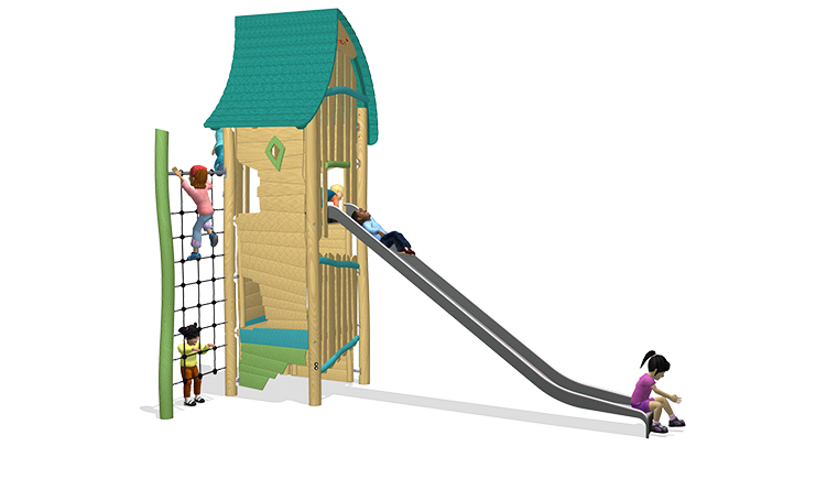 Multi deck tower with slide, net and fireman’s pole. The 1st platform level is a playhouse with windows & seat. The 2nd level with two egress activities. The product is available in 3 versions: 1: Unthreated Robinia wood. 2: Brown oiled wood. 3:Combined color and unthreated wood. FSC certified robinia wood on request.