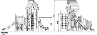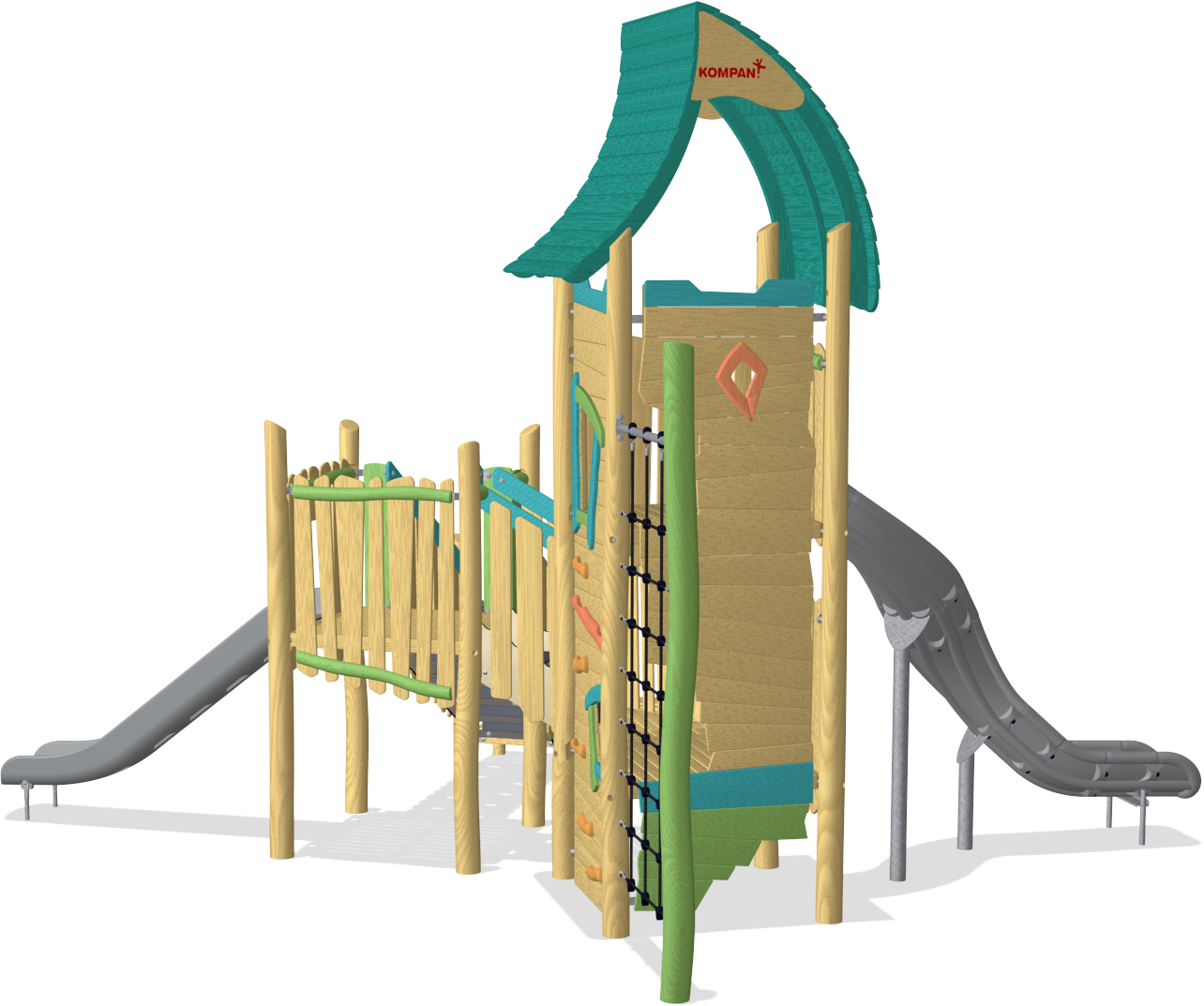 This tower invites multi-level, varied climbing and sliding. A play table next to the accessible stairway up to the lower sliding platform invites gathering and meeting. From the platform the child can slide down or progress to the next platform level, where a taller slide can provide ride back to ground level. It also provides a rope climbing and a wall climbing access to the highest platform as well. The lower tower is designed to allow for children with walkers or wheelchairs either playing at the table or using the stairway.