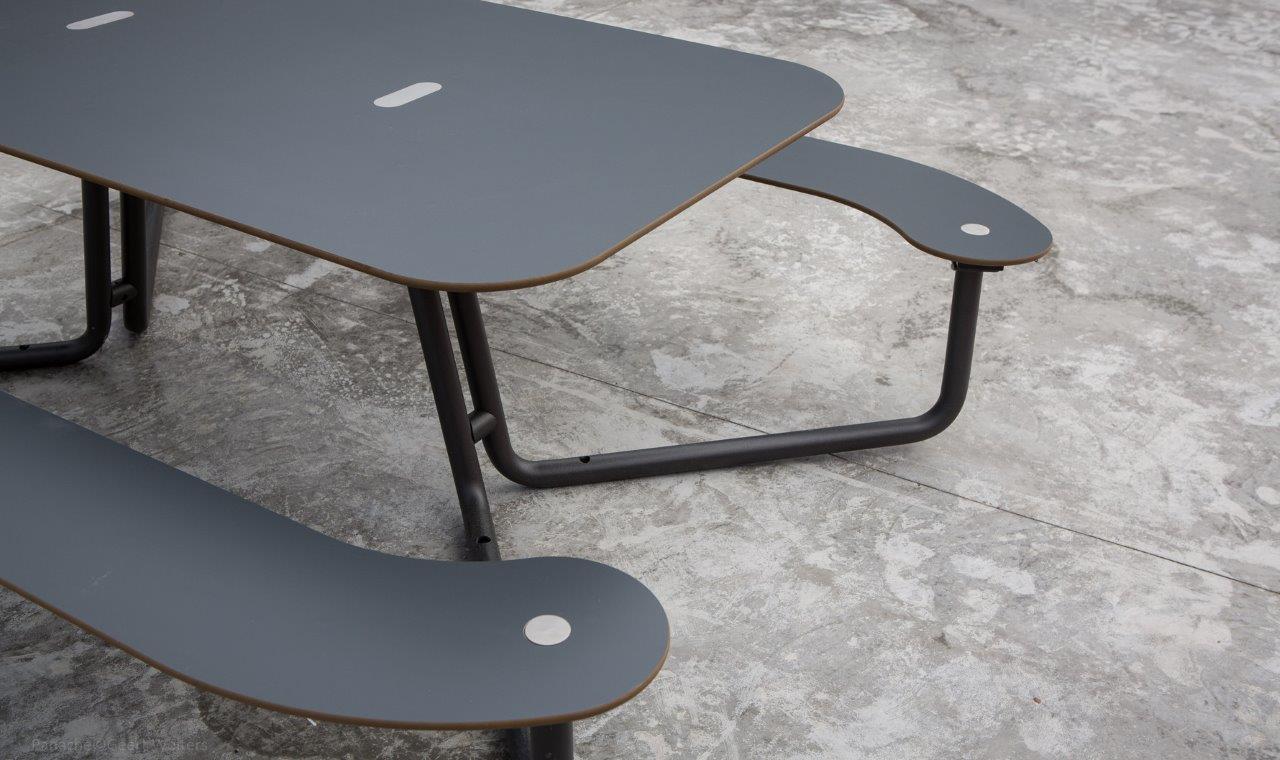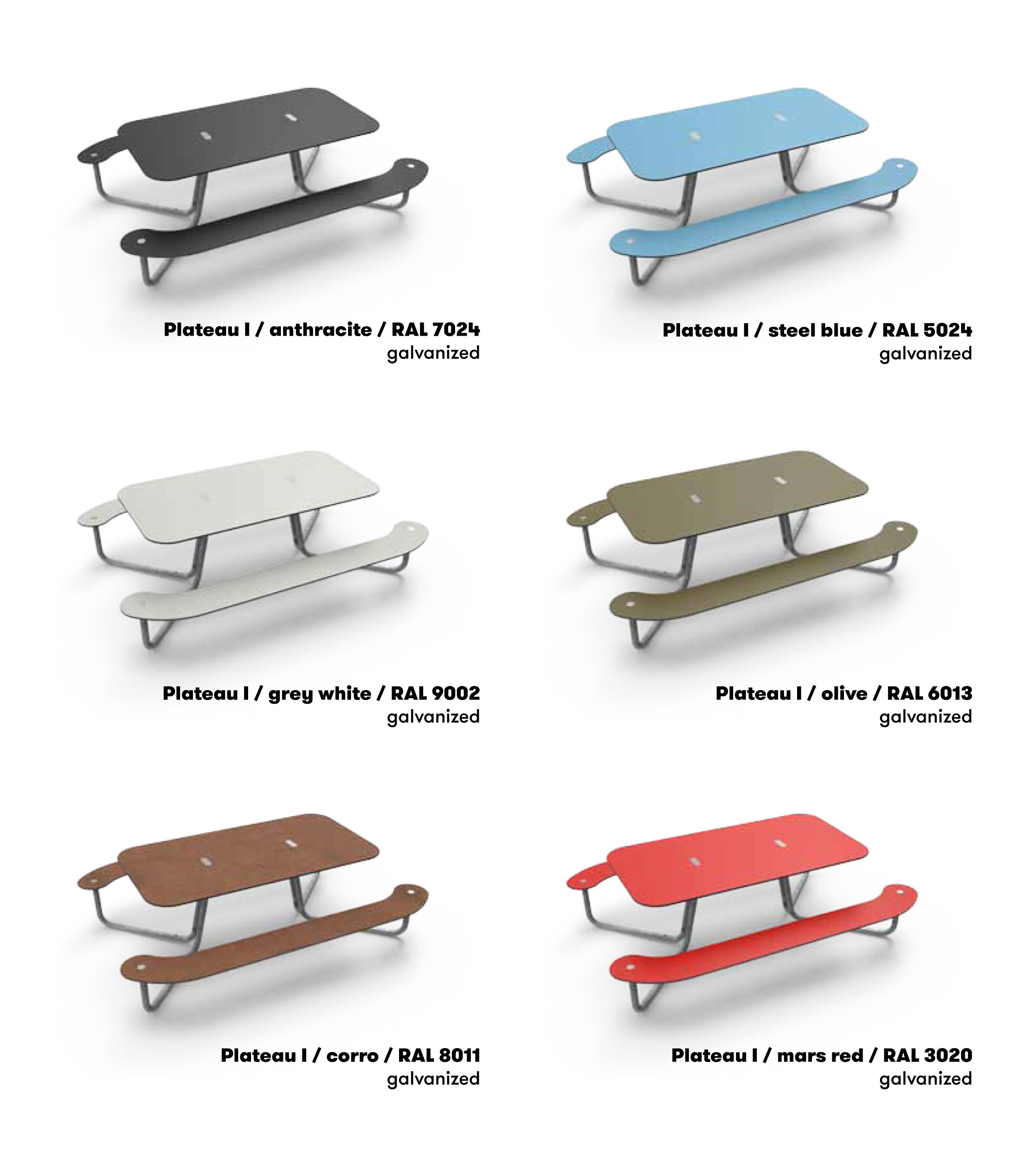Seat/tabletop: robust, multi-layered and dyed 12mm HPL (High Pressure Laminate) available in 6 colours. Highly UV- and weather-resistant, solid mechanical quality and durability. Frame: Hot galvanized steel or hot galvanized steel + textured, antrachite powder-paint. Approx. colour code RAL 7024. Disc: Bead blasted stainless steel.
