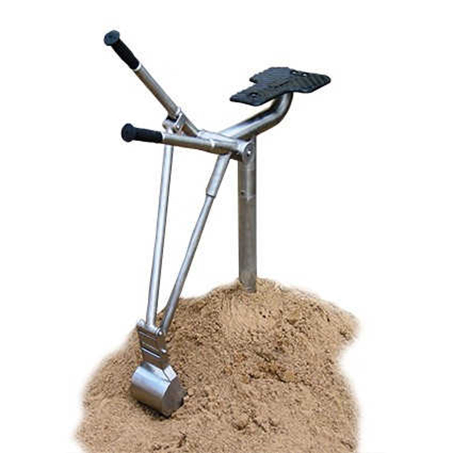 A stainless steel digger for sand pits. Full 360 degree rotation, twin leaver digging action and soft rubber seat.