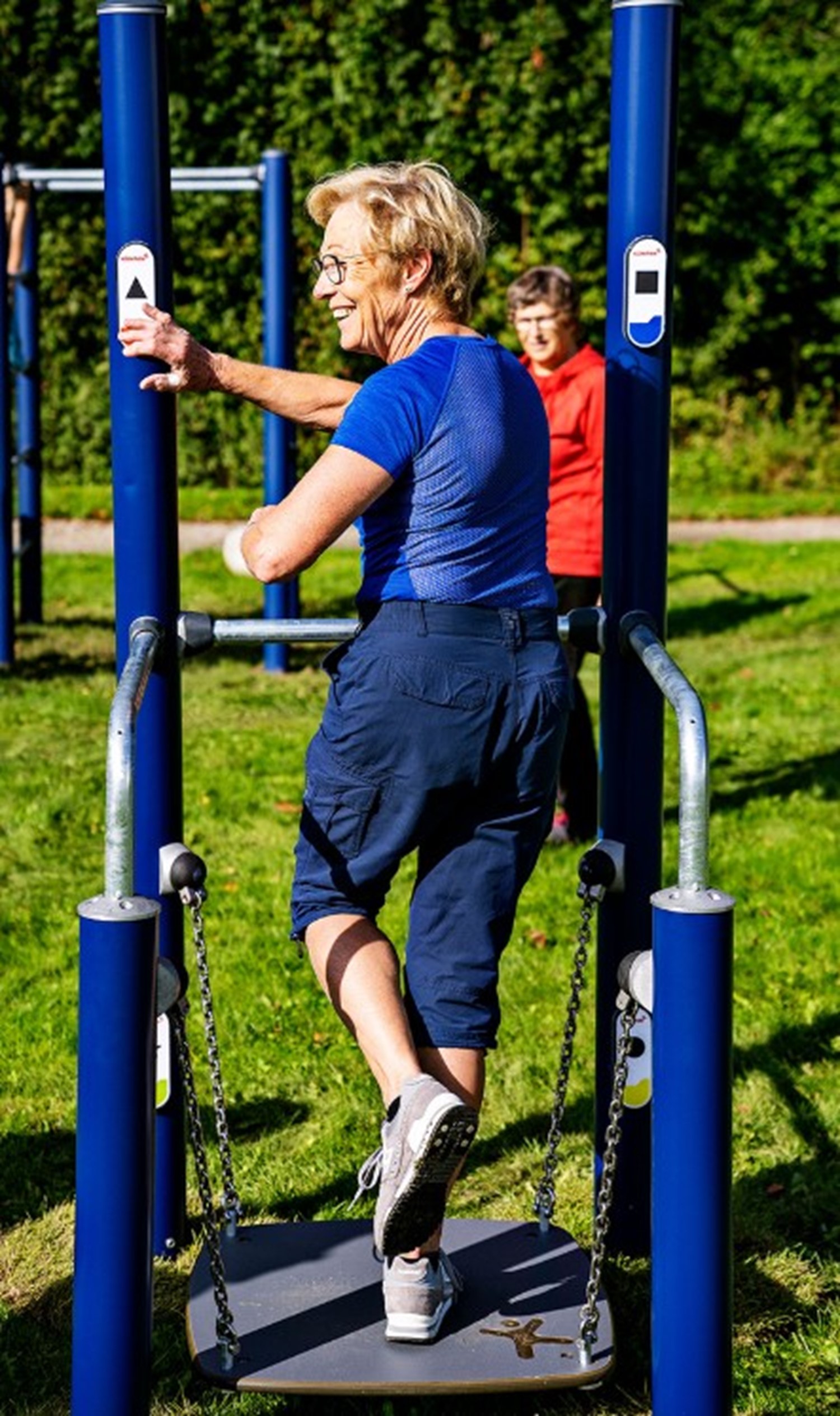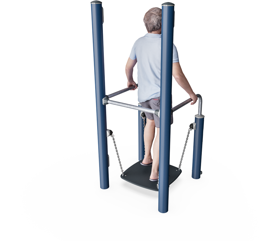 The reactive balance board resembles situations where the contact with the surface suddenly gets unstable. The Balance board mimics situations that occur in metros, buses or on slippery surfaces. It can be used on one or two feet with or without support, but for even more challenging exercises the signs on the high posts can be used. By alternatingly touching the different symbols in a pre-defined pattern with right and left hand both full body balance, coordination and cognition can be challenged.