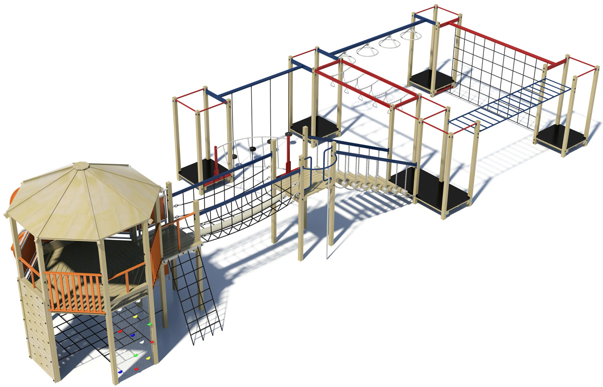 At the top end of the structure is our spacious Octagonal Deck Tower – perfect for hanging out – which is fitted with an eye-catching 2m high Spiral Tube Slide. The Adventure Rope Bridge connects the Tower to a double play circuit with a range of climbing, upper body and balance challenges. These have been designed make sure there is always plenty of challenge for the older kids but allowing for the younger users to gradually progress as their strength and confidence grows. This design is built to withstand heavy use from the large numbers of kids that all want to play at the same time during their breaks. With sliding, climbing, balance, upper-body, spinning, socialising and imagination play all covered, this massive playground has enough fun and challenge for the whole school!