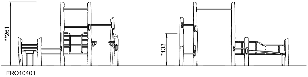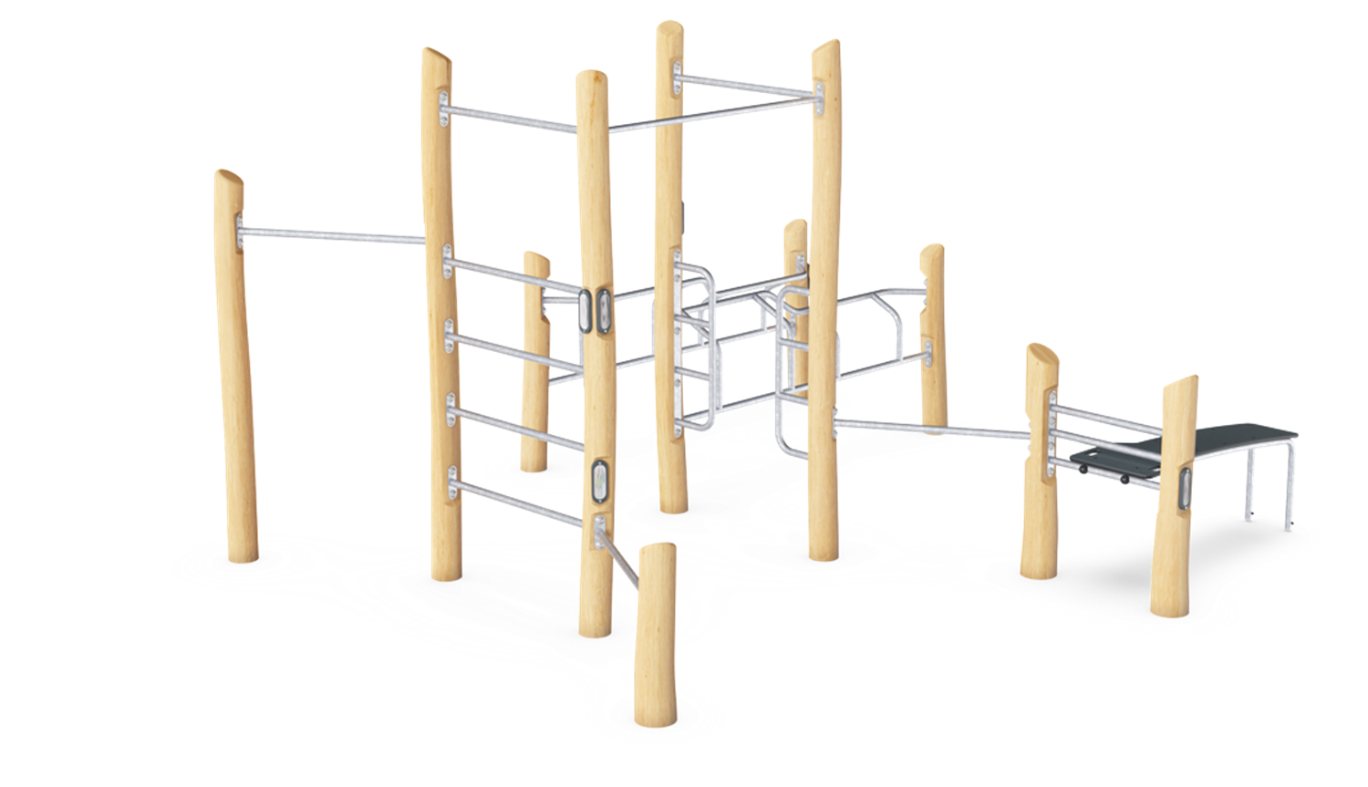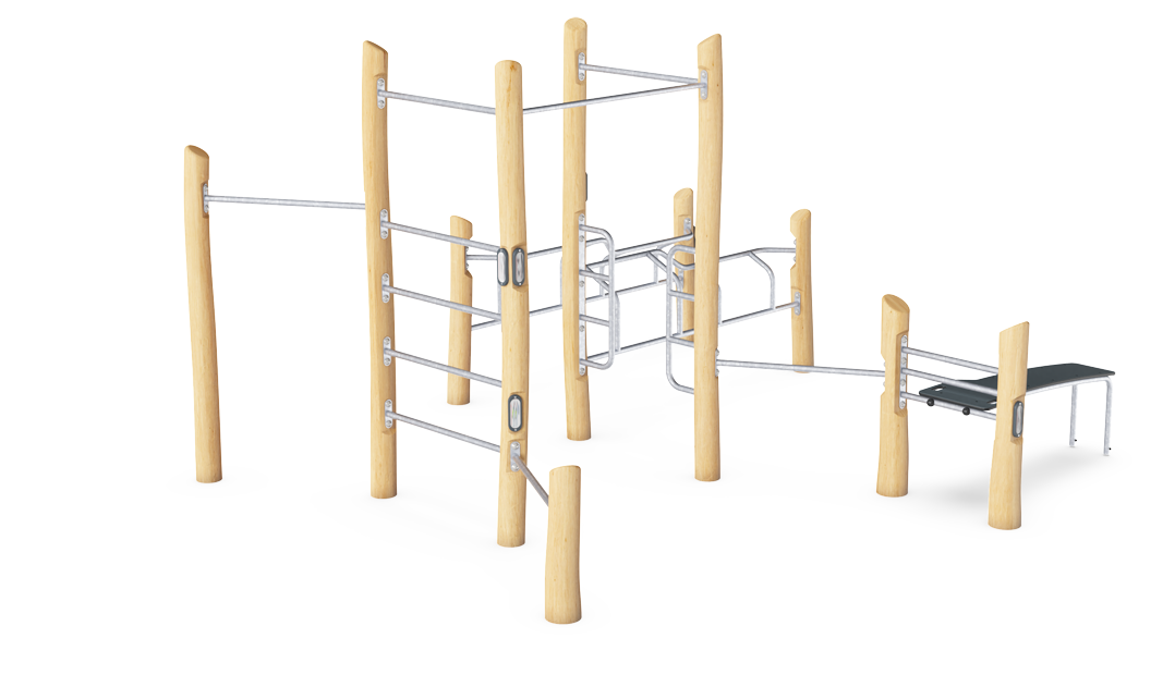 Compact and complete street workout and calisthenics combination for training and competition. It features an incline bench, parallel bars, push up bar, decline press, Swedish ladder, human flagpole and pull up station. Seven workout stations in one, and all within only 41 m². The 138cm wide pull up bars are designed to give plenty of space for dynamic exercises and promote sideways exercises such as the typewriter pull up. The wide bars also allow for users to do pull ups next to each other and thereby compete or motivate each other.