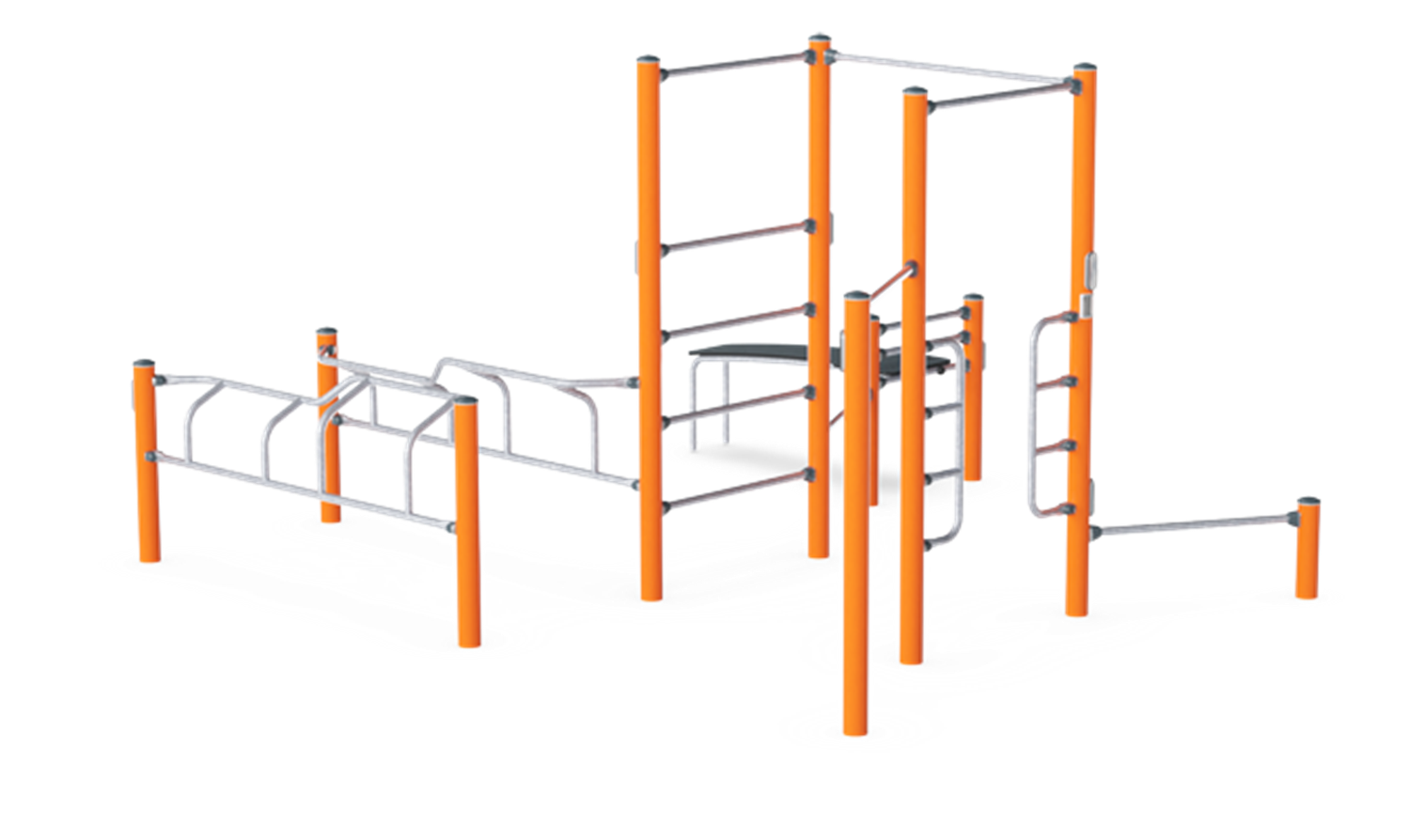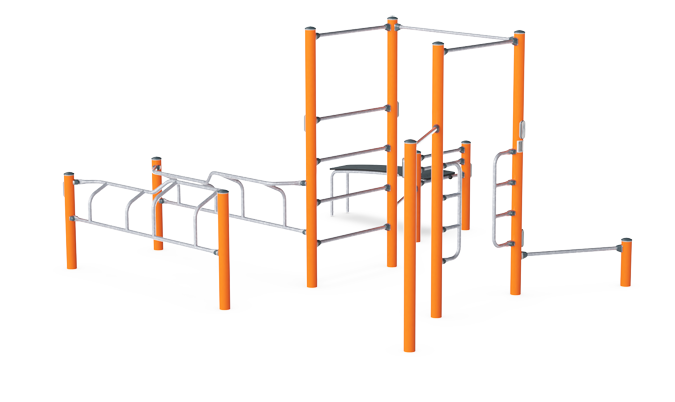 Compact and complete street workout and callisthenics combination for training and competition. It features an incline bench, parallel bars, push up bar, decline press, Swedish ladder, human flagpole and pull up station. Seven workout stations in one, and all within only 41 m². The 138cm wide pull up bars are designed to give plenty of space for dynamic exercises and promote sideways exercises such as the typewriter pull up. The wide bars also allow for users to do pull ups next to each other and thereby compete or motivate each other.