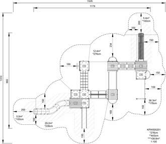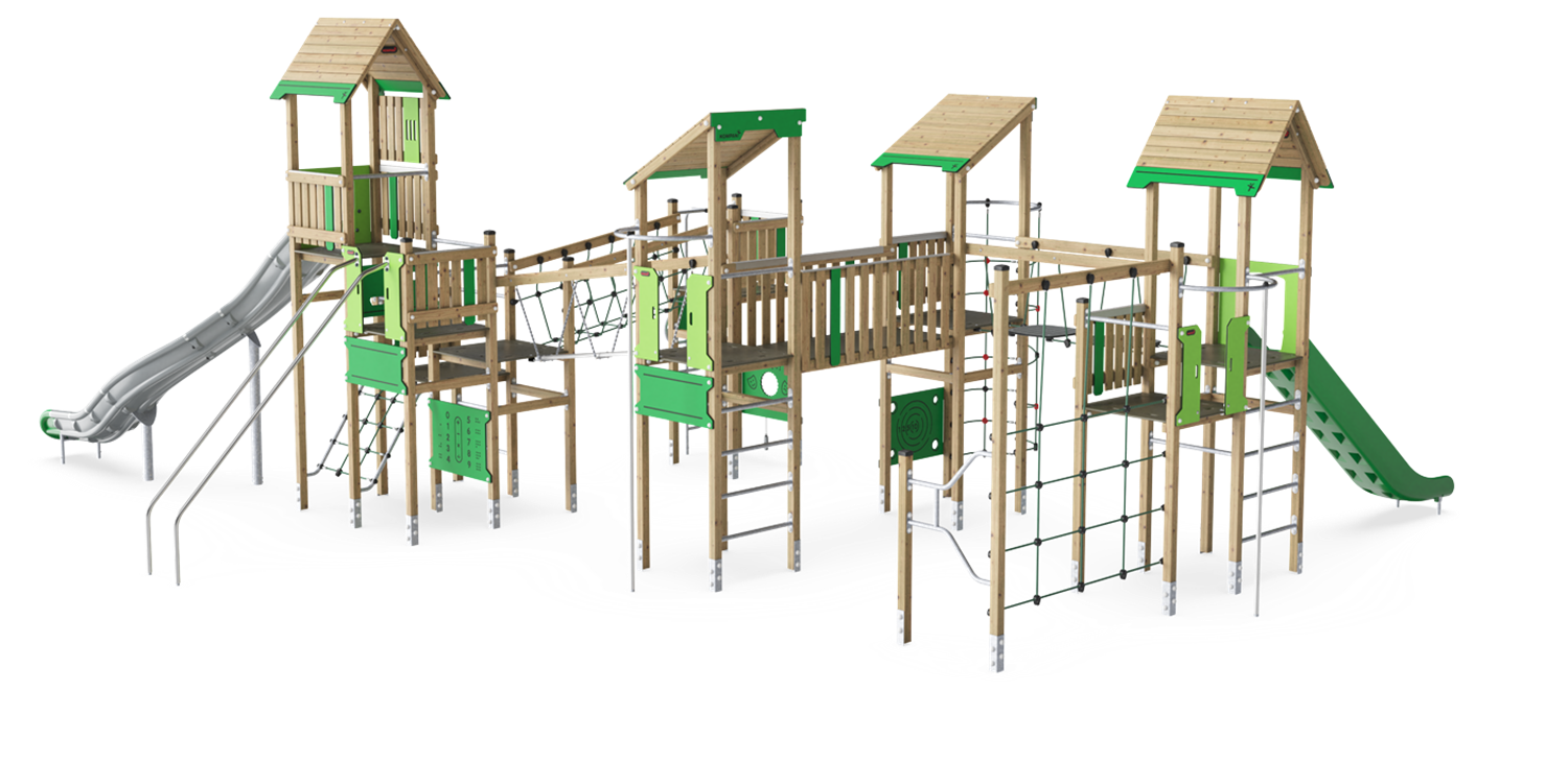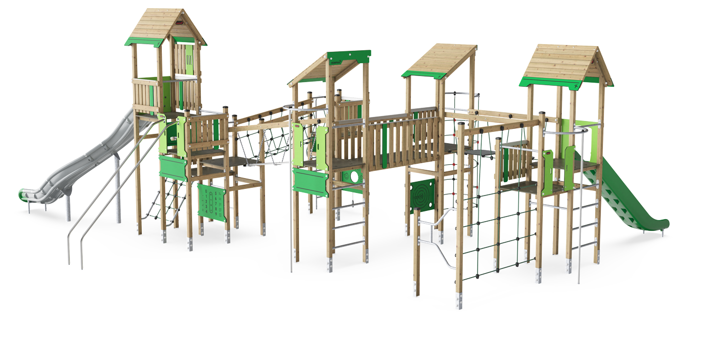 This five tower play structure offers rich play variation and a high play capacity. This combination will make children play for a long time and want to come back again and agian. On ground level, three different play panels create each their fun play retreat. The Milled Music play panel serves as an excellent meeting point for social interaction and cooperation. By moving the stick across the millings, children can create sounds, helping them develop an understanding of cause and effect. The panel also encourages dramatic play, which fosters language development and communication skills. The many different ways of climbing up on the platforms, via different ladders and climbing walls make play explorations worthwhile. They additionally train the child's cross-coordination and muscles. The links between towers have different characteristics, from a balance beam and swaying wackle bridge to stable as well as wobbly net crossings. The way down can be graduated from the fast slide to the dare-devil fireman's pole or banister bars. Playing here guarantees training of all major physical development areas. It also guarantees fun play with friends, stimulating social-emotional developmental domains.