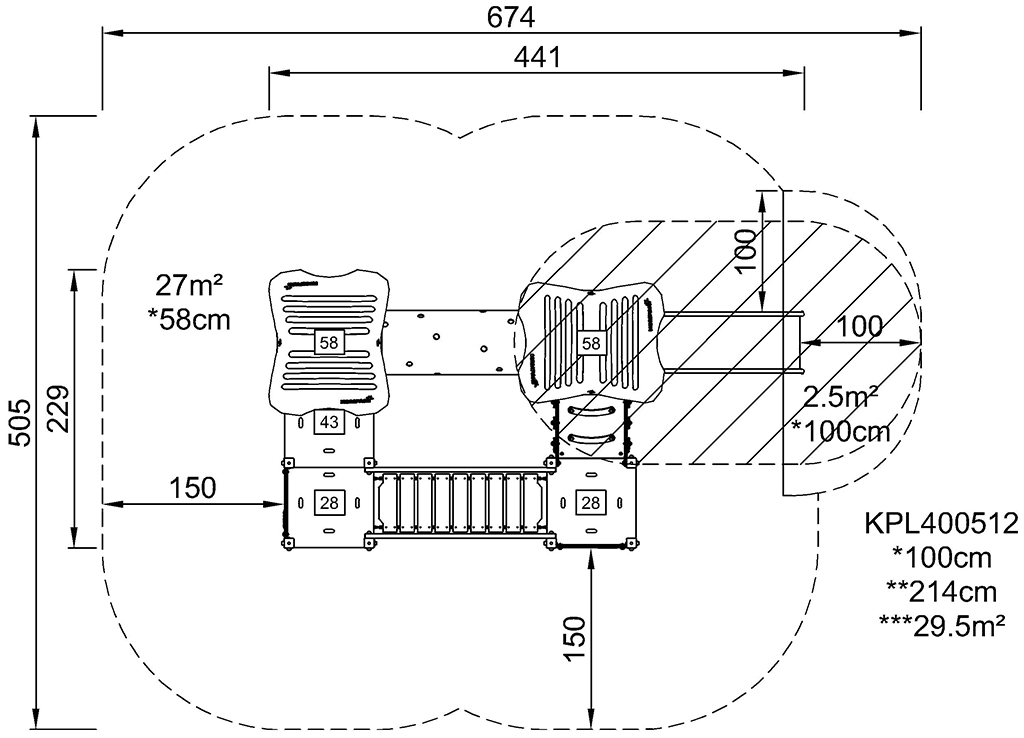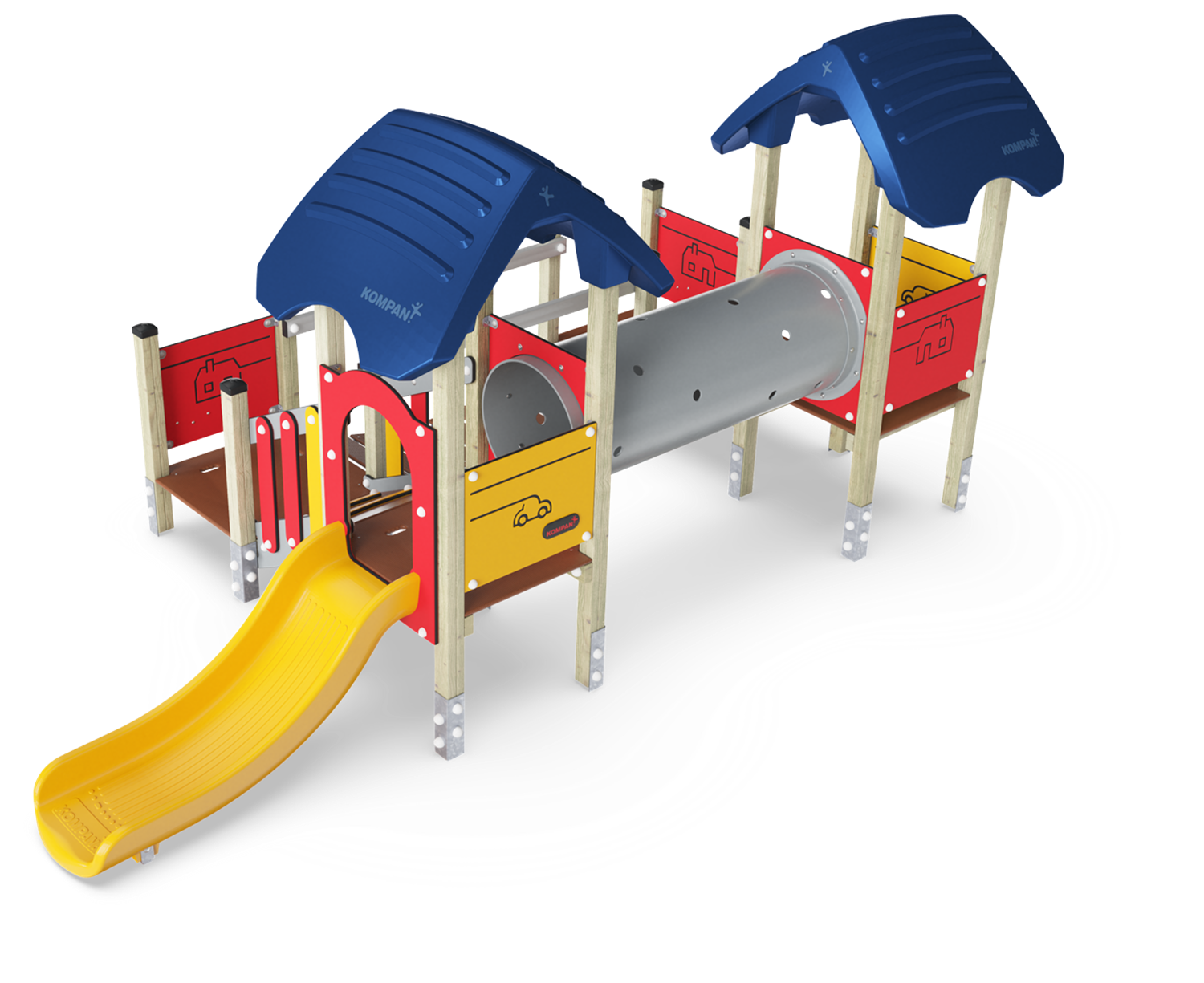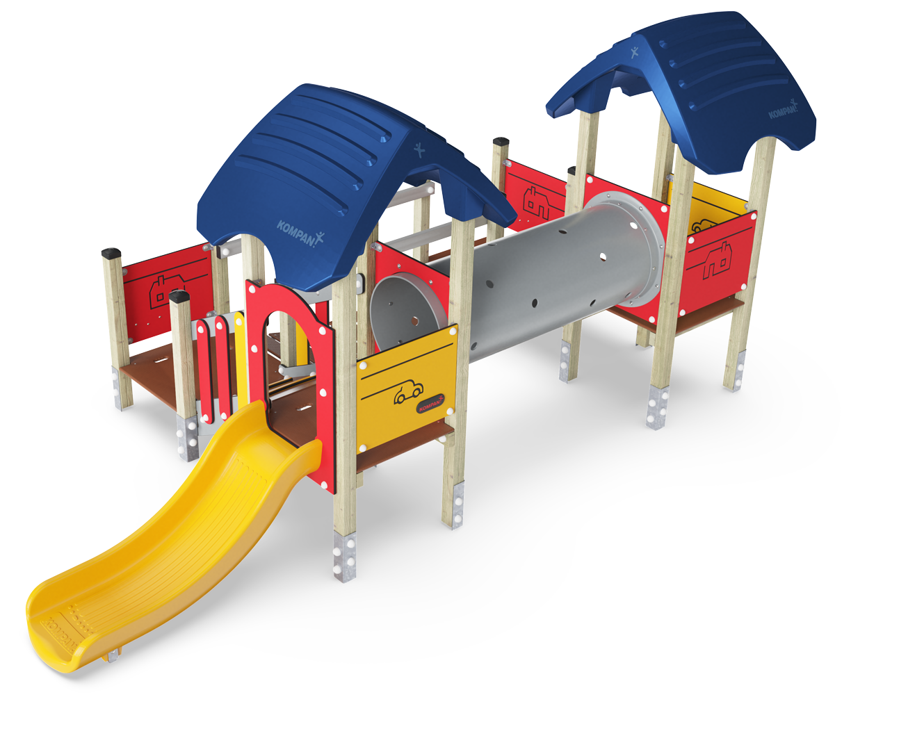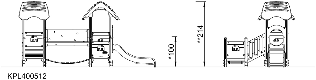 The Four Tower with Two Bridges offers a wealth of diverse climbing, crawling and sliding experiences. The diversity in play experiences make children come back again and again. The different bridges offer each their muscle and motor skill stimulating play event: the step bridge offers graded access, each platform offering a point for a break or a meeting. The tunnel takes sliding or crawling through, both great for the cross-body coordination. This trains the cooperation between the left and right brain half which is necessary for later reading skills. The slide stimulates the spatial awareness, needed for navigating space, e.g. in traffic, securely. The inclined bridge with skid preventive floor details support less physically confident users. This is the obvious play activity for e.g. children with physical disabilities, with a perfect distance of access point on ground level to egress point.