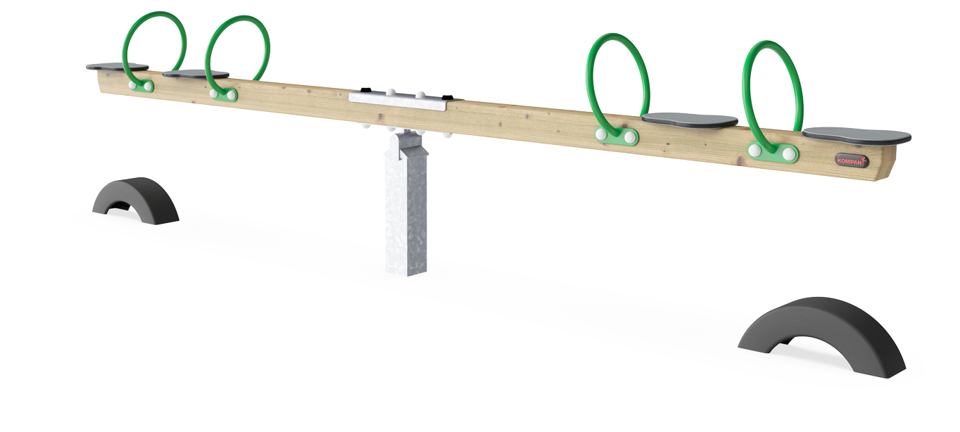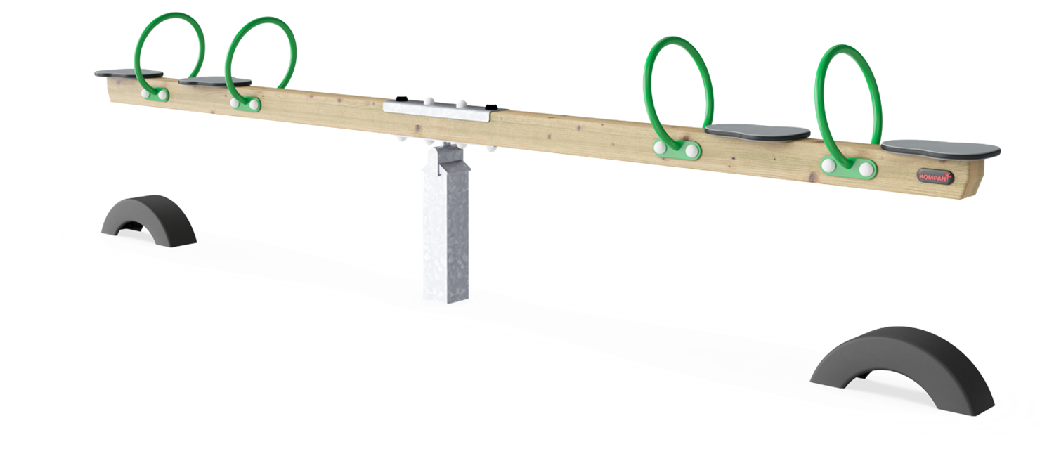 The Grasshopper Seesaw 4 Seats is a playground classic. It still attracts players again and again, as it has for generations. The archaic play event is still with us for a reason: the tickling in the stomach when going up high, going down fast is eternally appealing. The Seesaw 4 Seats develops the sense of space and rhythm and leg muscles of children. These are crucial motor skills that help children navigate the world securely, e.g. in the street when estimating time, movement and objects. The social dimension and degree of trust in your peer that is demanded when seesawing, is great training of social-emotional life skills such as turn- taking and cooperation. With four users, empathy is trained, too. Players will need to consider others' limits and limitations. Especially in groups of four, the seesawing is a fantastic social play event.