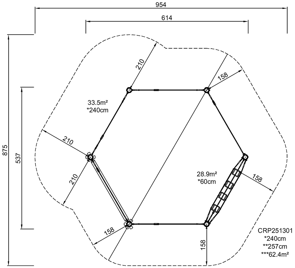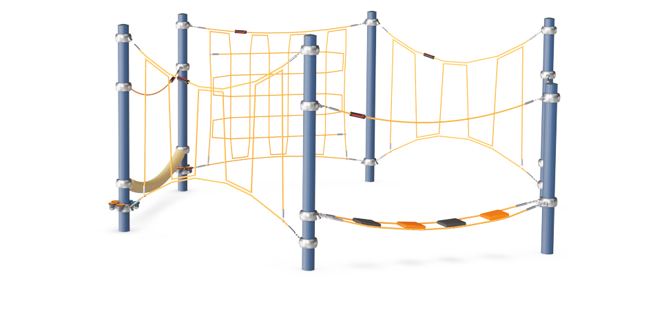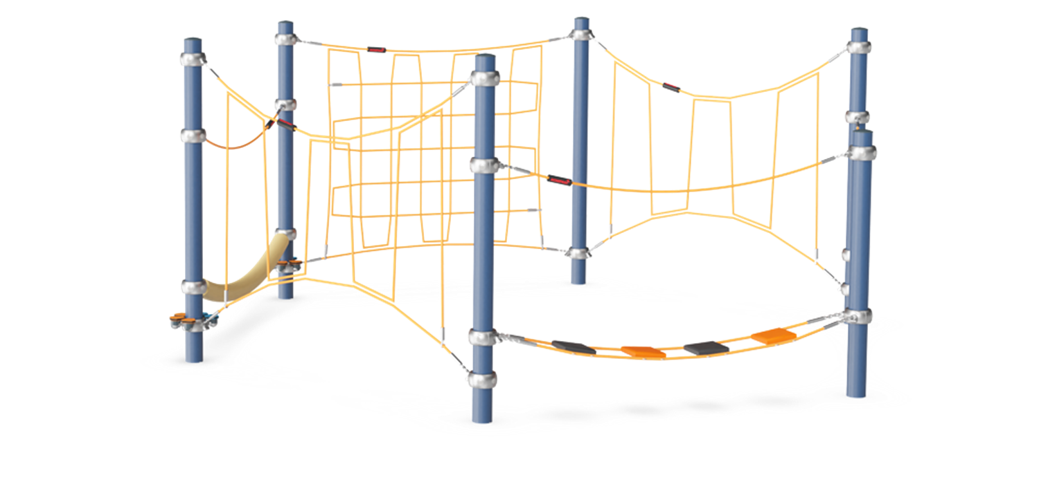 The Honeycomb Trail is a versatile, transparent combination of climbing and meeting activities that will attract children again and again. The slalom of activities invites timeless games like "the ground is made of lava" that, apart from being fun, train children’s agility, balance and coordination when in a unit like the Honeycomb Trail. These fundamental motor skills help children manage a range of life skills in the future. The mix of overhead, cross-body and climbing activities additionally builds muscles and movement controls. Apart from being hilarious to crawl, climb and balance, the responsive, swaying ropes and nets support social play as children can watch each other throughout the circle of play. The many horizontal ground level ropes invite meetings, too.