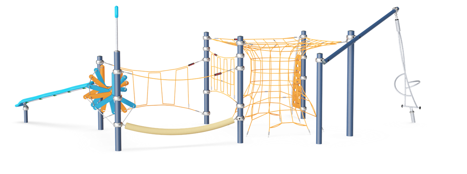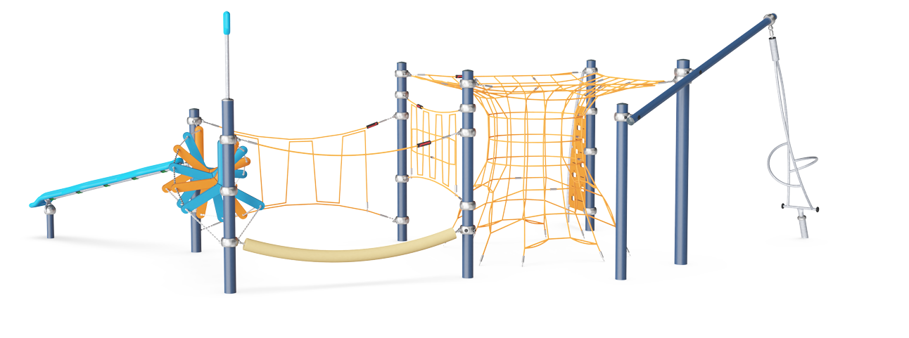 The Javan Trail invites thrilling, responsive challenges for children. The variety of play activities makes children come back again and again for more fun. The responsive, swaying ropes call for concentrated movement, adjusting grips and rhythms of climbing. This trains the child’s agility, balance and coordination. These motor skills are fundamental for moving confidently in the world. They build the basis for e.g. concentrating on tasks and sitting still for longer periods. Apart from being great fun, the varied climbing, crawling, tight-rope walking and spinning activities train arm, leg and core muscles. The Propeller Climber provides a fun crawl-and-meet place. The Musca Spinner exhilarates groups of children when pushed into motion. This incorporates an understanding of gravity principles. The cooperative effort supports empathy, turn-taking and self-regulation; skills that help children make friends for life.