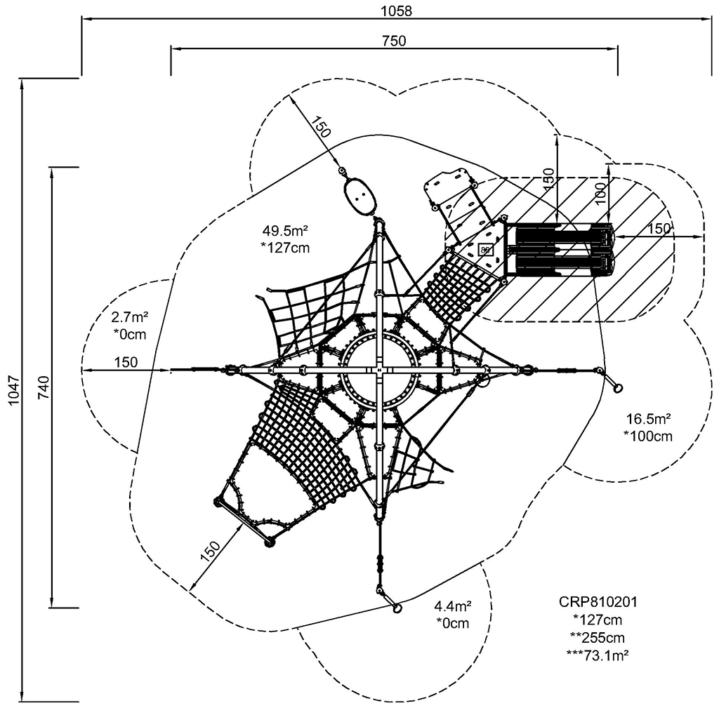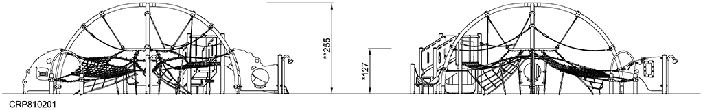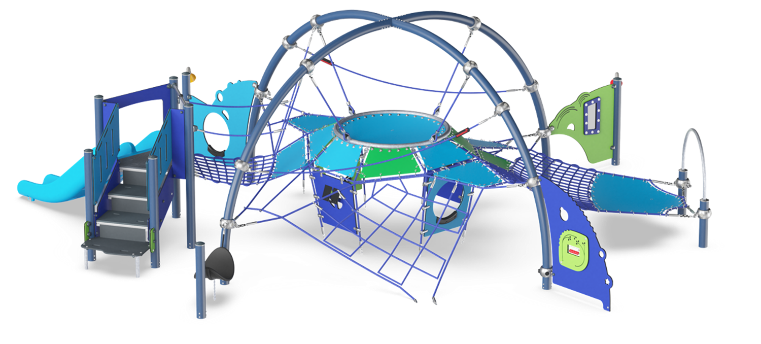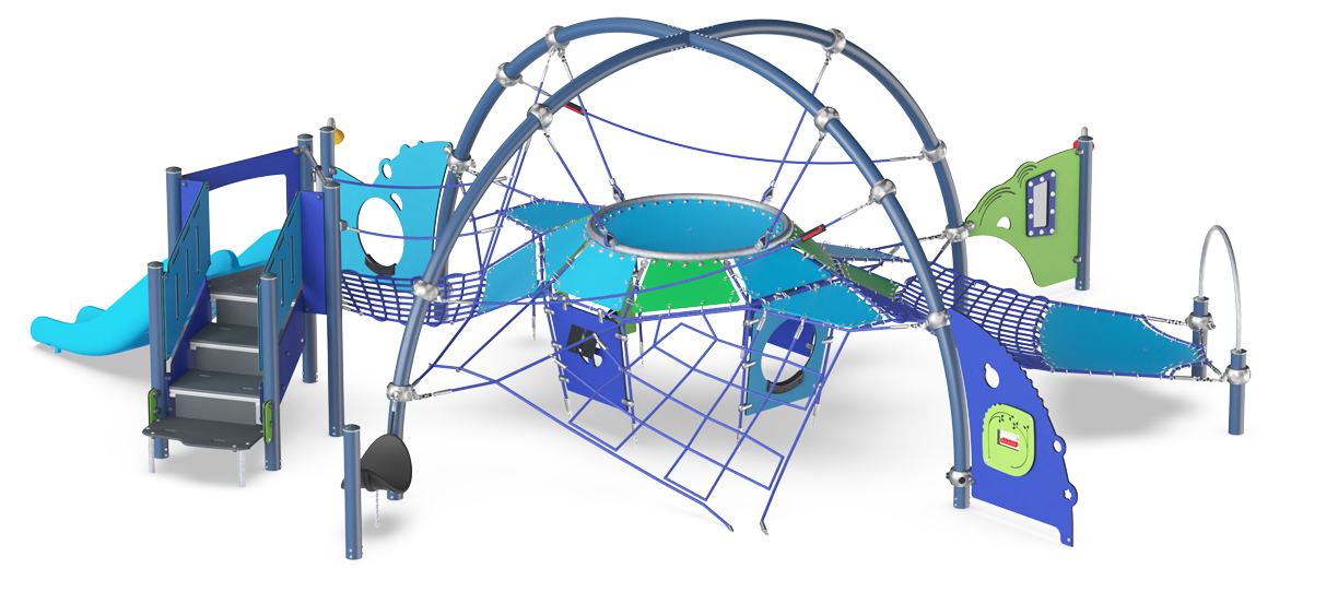 Marvelous Mini Dome amazes children with its richness in play variation and detail, again and again. The Dome can be entered from all over: membranes, nets, climbing ropes, and stairs take the toddlers to the top membrane circle. This viewpoint invites friends to meet. Under it, a cozy den is created with varied climb or peep-through membranes that invite play classics such as peek-a-boo. The panels and hammock around the central nets allow for dramatic play and exploration with sensory details. The slide is a play magnet and completes the play offerings that train motor skills such as balance, coordination and proprioception. These are fundamental in moving the body confidently and securely. The varied movements additionally instill an understanding of space, shapes, and measures which is fundamental for understanding mathematics. The Mini Dome offers great play capacity, so children learn turn-taking skills through play and make friends that way.