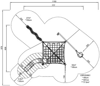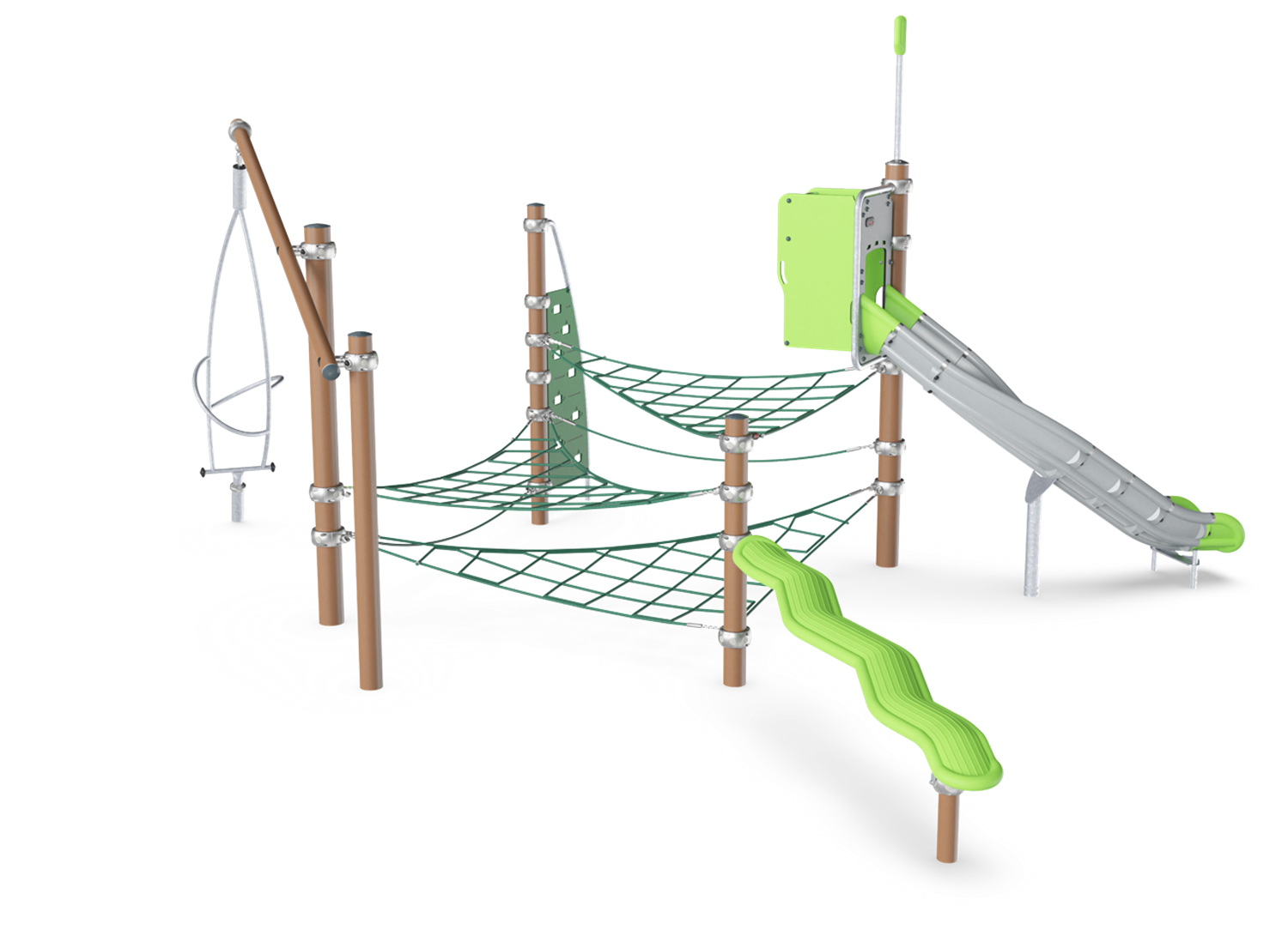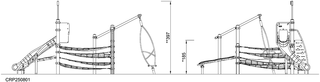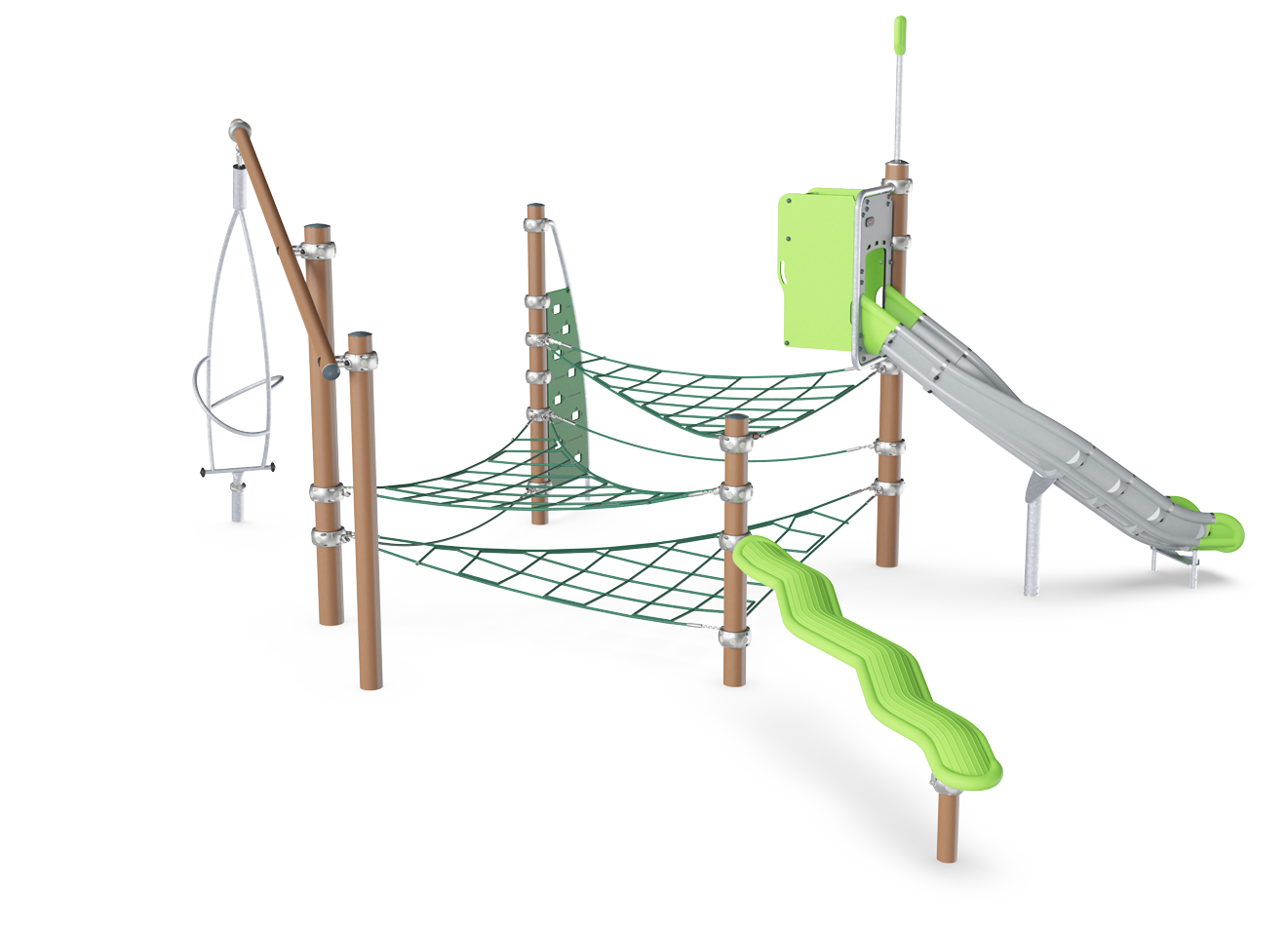 The Mountain Trail is an exciting and multifunctional play structure that attracts play instantly and invites back for more, again and again. From ground level children can crawl the Zig-Zag Slider and continue through the horizontal nets. Afterwards, they can chill in the nets before moving to the slide for a fun egress back to ground level. Climbing, crawling and balancing the Mountain Trail is a fun challenge which builds the ABC of motor skills: Agility, Balance and Coordination. These are fundamental to children's ability to navigate the world with body confidence. The Musca Spinner whirls around when children enter and put their upper body muscle force into pushing and pulling it around. The many responsive, active play features of the Mountain Trail invite socializing, turn-taking and empathy, important social-emotional skills for life.