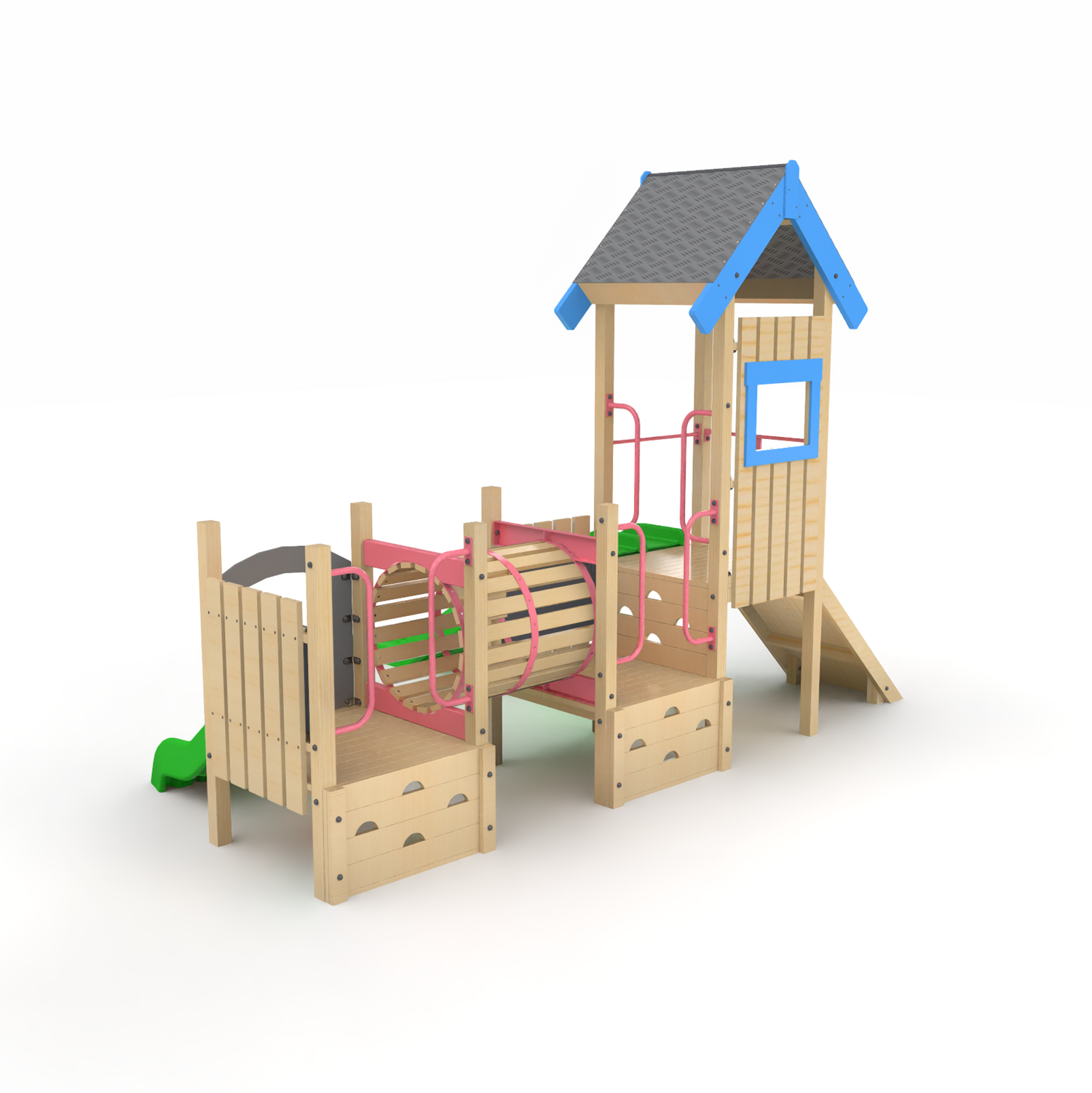 This play module is designed for children aged 2+ years, offering a dynamic and connected play experience that encourages both active movement and exploration. A central tower links to a secondary platform via a slatted crawl tunnel, supporting continuous play flow.
