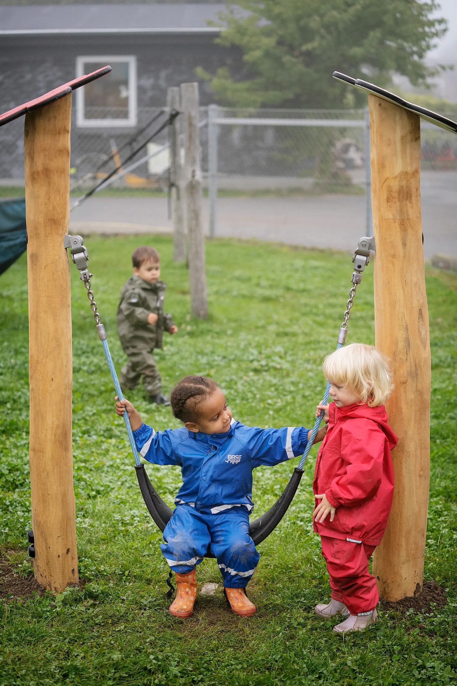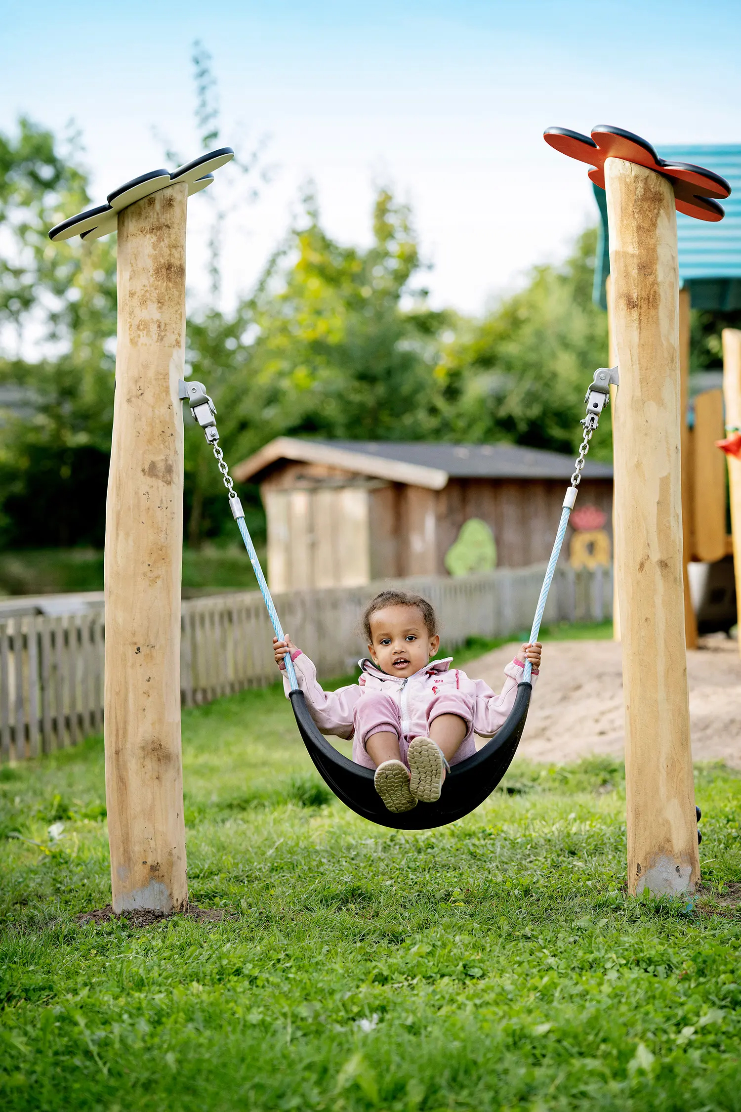 The daisies on the swing poles add a whimsical expression that radiates play to toddlers. The sturdy rubber seat is placed in the exact right height for a child to lean in and lie on the stomach. This serves two purposes: the child can swing and swing independently. When the child push with the feet, the swing movement starts and trains the child's motor skills, specifically the sense of balance and space. Furthermore, the understanding of cause and effect has a great impact on the thinking and cognitive skills of the child. The emotional value of being able to manage independently is priceless for toddlers and stimulates their self esteem and widens their physical comfort zone. Parents, older siblings and friends can easily join the fun.
