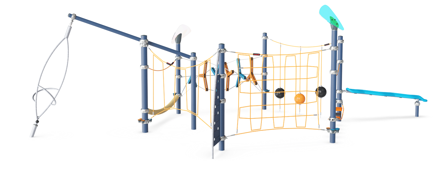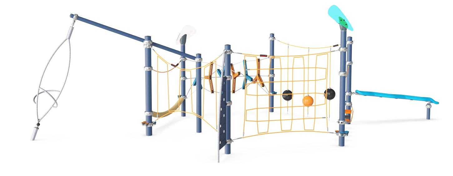 The Saimiri Trail’s WOW factor is its transparent, hugely varied range of difficulty levels in climb, crawl, spin, rotate, sway and balance activities. These activities help develop children's agility, balance and coordination, motor skills that are fundamental for a range of important life skills. Eventually, this supports a secure and confident navigation of the body. The fun loop of varied activities supports classic games, e.g. “the ground is made of lava”, which pump up the heartrate and encourage cooperation. The possibility to communicate across the play unit and take breaks at several destinations supports turn-taking and communication, important social-emotional skills that are supported in play. The Musca Spinner offers a solitary spinning point at hilarious speed, where children use all body muscles to push and pull themselves into fast rotation. This supports empathy and cooperation, and not least an incorporated understanding of gravity.
