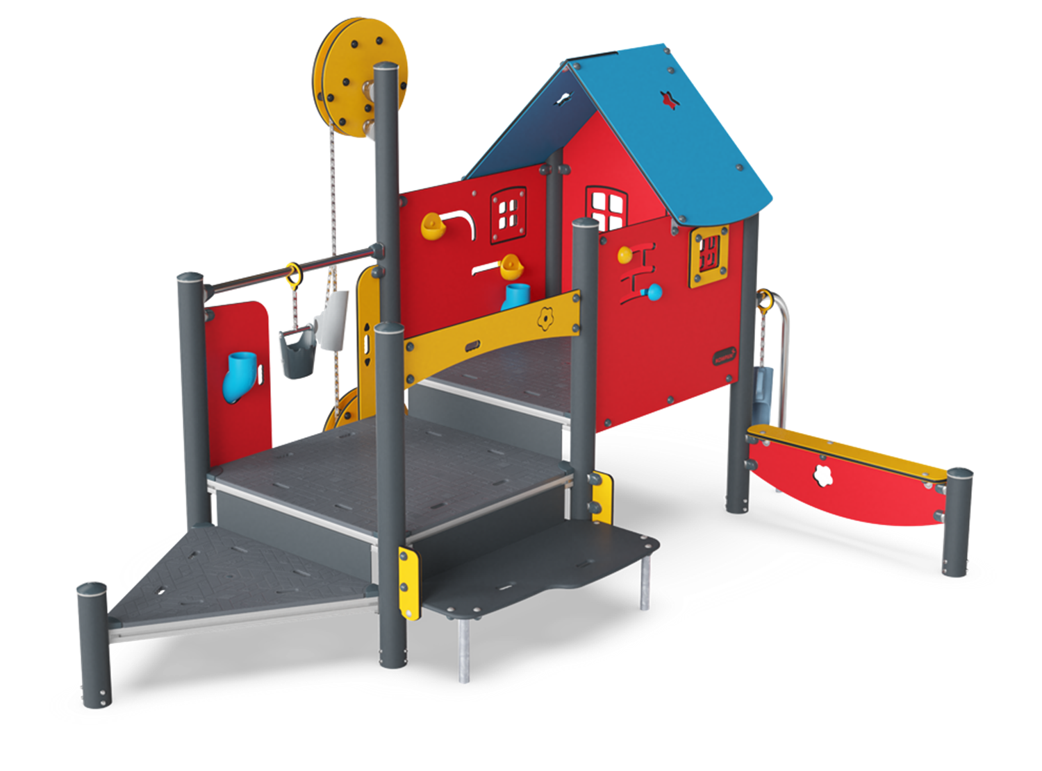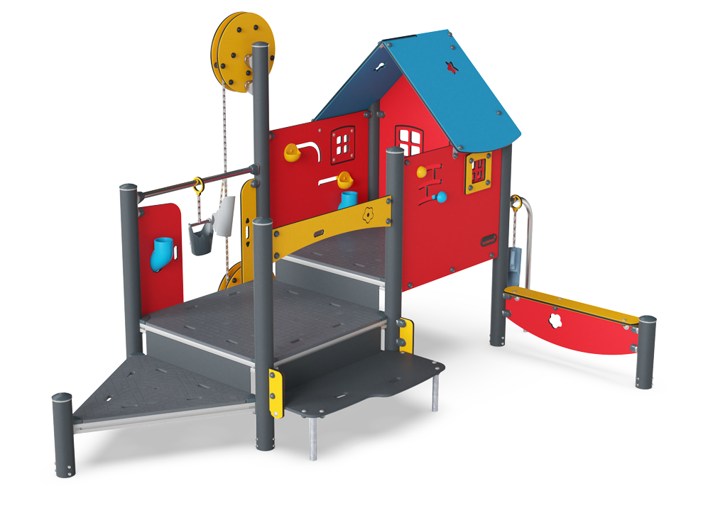 The Sand Creator is an immensely attractive sand play unit that will absorbe children in play for hours and hours. The crane is worked by pulling the chain. The sand bucket will go up or down or all around, but it will stay put when the chain is let go of. This, apart from providing fascinating sand play, is a great training of children's logical thinking skills. The negotiation and cooperation to get sand to and from the funnel via the bucket is great for older children and develops social-emotional skills. In the house, multiple tactile elements can be moved to entertain children who wait for the sand crane. The sand funnel here supports children's understanding of object permanence: that things can still exist when out of sight. The platform is open and can be accessed in multiple ways, allowing for all users to play.