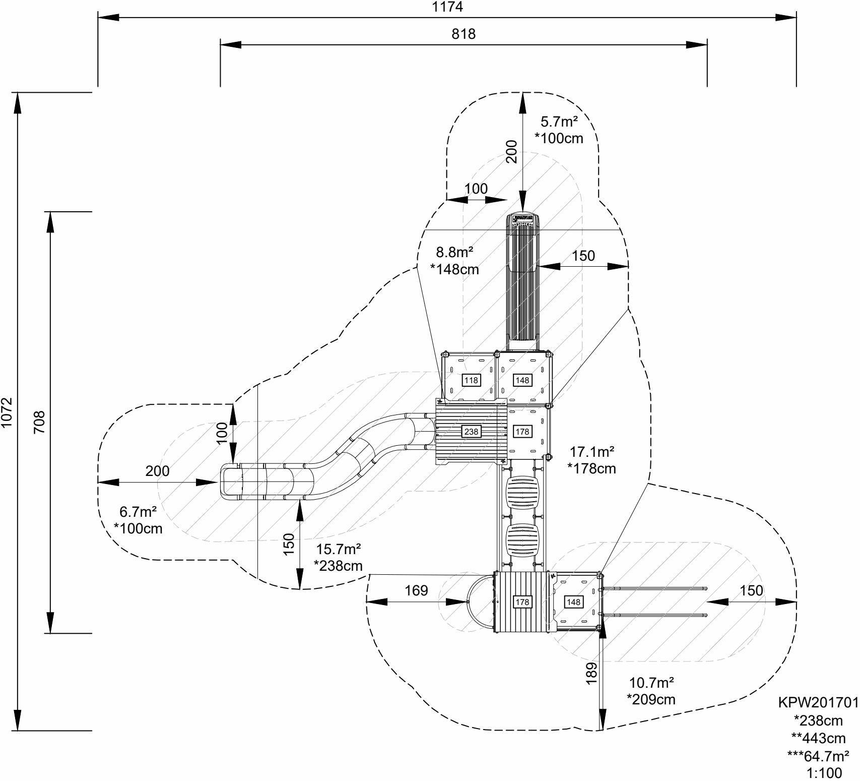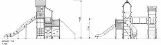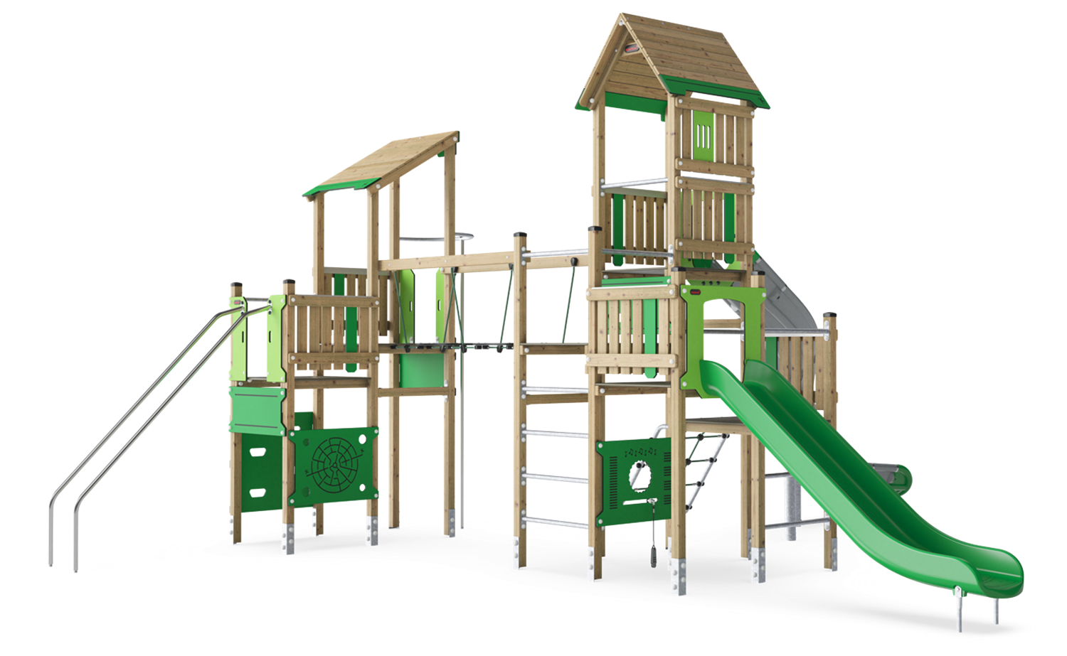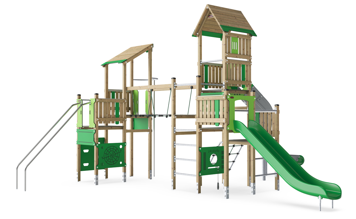 This wonderful combination of fun and challenging play activities creates an irresistible play unit. Children will try it out and come back for more play, again and again. The layers of challenging play add something new to try out in every corner. And the varied play panels on ground level create corners for quieter play breaks also. The tall tower with a daredevil fireman's pole and banister bars, offers excellent training for muscles and motor skills—especially for older children. It can also be accessed by crossing the wackle bridge, an exciting challenge that encourages children to balance and gently sway as they make their way across. This activity helps develop their sense of balance and spatial awareness. Reaching the top of the tower comes with a rewarding egress: a thrilling ride down the tall, curved slide. Beyond being great fun, sliding helps strengthen core stability and train the child’s sense of balance. At ground level, a Milled Music play panel serves as an excellent meeting point for social interaction and cooperation. By moving the stick across the millings, children can create sounds, helping them develop an understanding of cause and effect. The panel also encourages dramatic play, which fosters language development and communication skills.