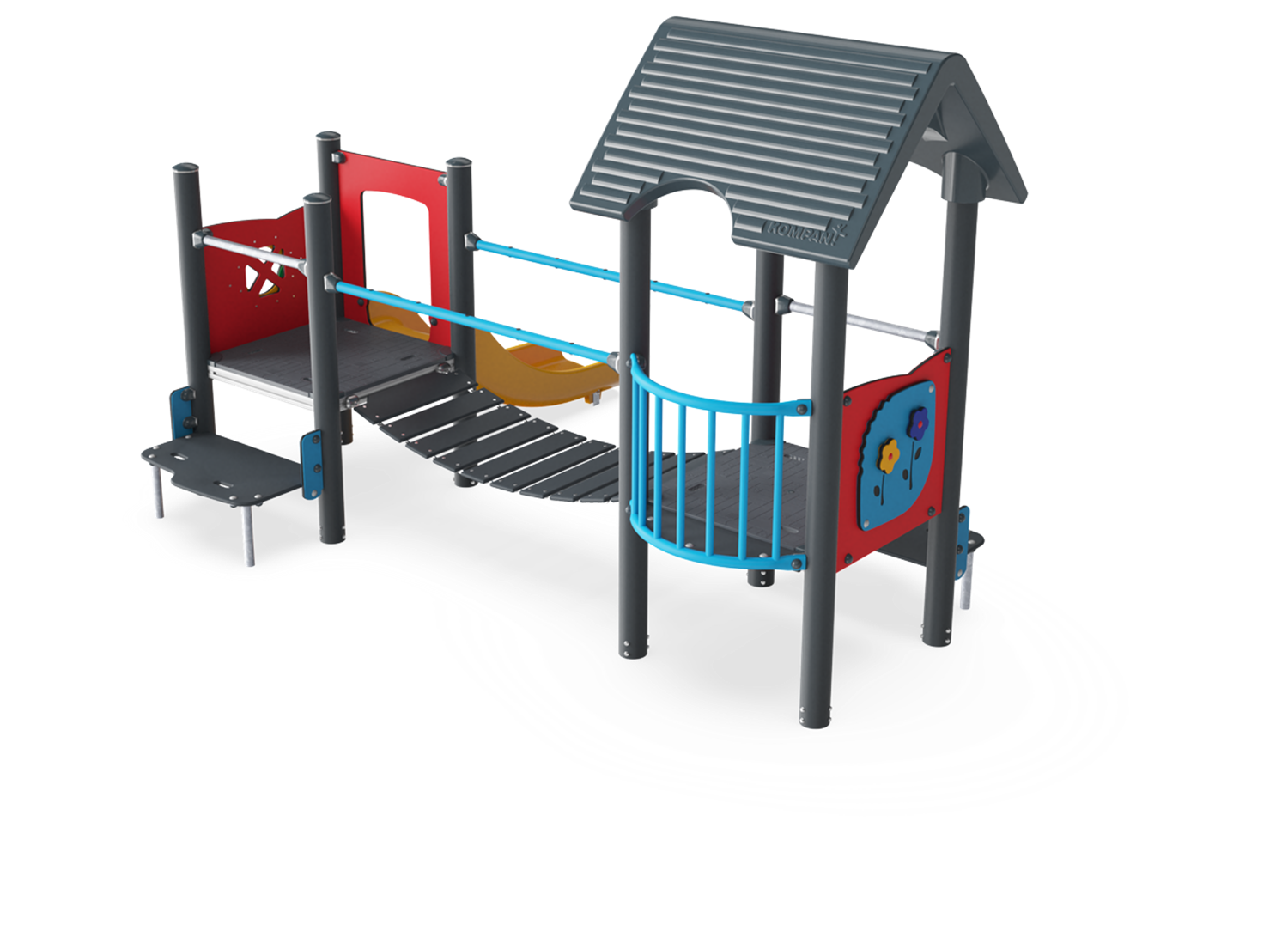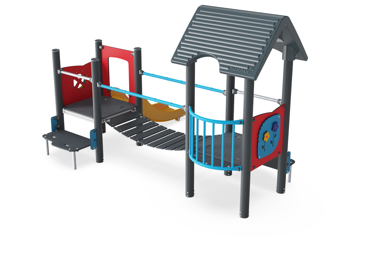 The Two Towers with Bridge-structure holds amazing play attractions for toddlers. The variety of physical play events will make them come back for more play, again and again and stay playing for a long time. The step stairway is spacious enough for two children to pass each other. This makes sense as looping the bridge, slide and stairways is a favourite activity on the Two Towers with Bridge. Walking or crawling up the stairs trains cross-coordination, important for. cross-modal perception and reading skills. The bridge is an amazing, moving balance trainer that stimulates all the vestibular system of the child, fundamental for all other motor skills and the ability to manage the world safely. The slide gives a stomach tickling trip to the ground, stimulating the core stability and the sense of balance of the child.
